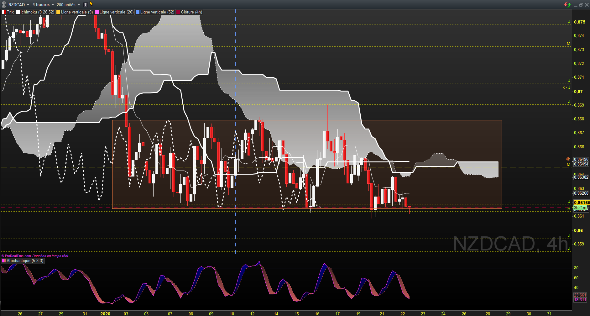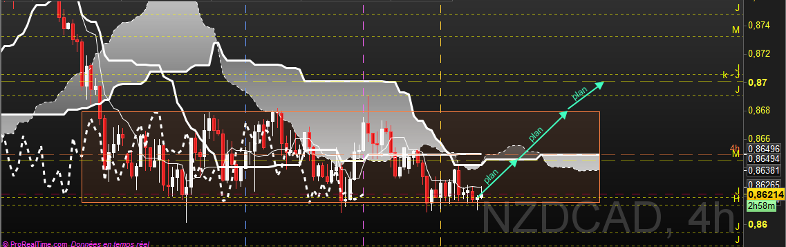 Plan: long en cas de signal H4 sur bas de range. On surveillera particulièrement la ZE du range H4 qui est la résistance mensuelle dont nous avons parlé. On peut viser le haut du range H4, la kijun daily et pourquoi pas à terme la kijun mensuelle.