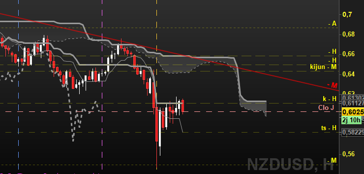 ici, je ne serais certainement pas acheteur, et même plutôt vendeur compte tenu de l'avalement baissier daily observé hier au contact des résistances des Ut supérieures. Si on veut prendre moins de risque, il me paraît sage d'attendre que la kijun H4 casse à la baisse avant d'entrer. On note que le niveau de cette kijun H' correspond au support kijun pour chikou hebdo: cette cassure sera donc importante pour valider un retournement baissier. Concernant un plan avec entrée en H4, c'est clairement contre-tendance, mais je dirais attendre cassure de kijun puis pullback jusqu'à son contact avec entrée short sur chandelier de retournement et tenkan daily en TP1, kijun daily en TP2 (on remarque que la zone 0.626 comprends la kijun daily, kijun mensuelle et tenkan hebdo: parfait support important pour attirer les prix).