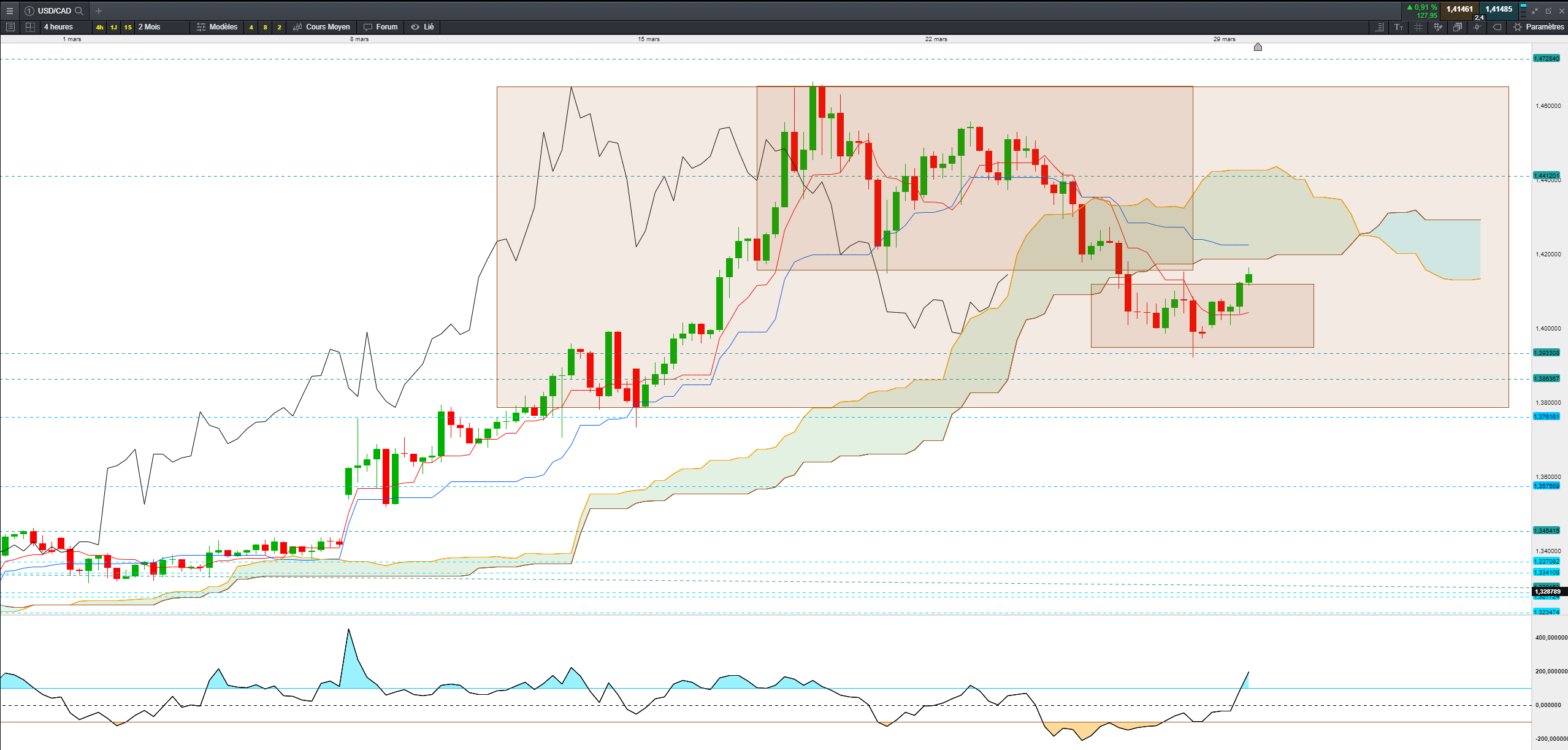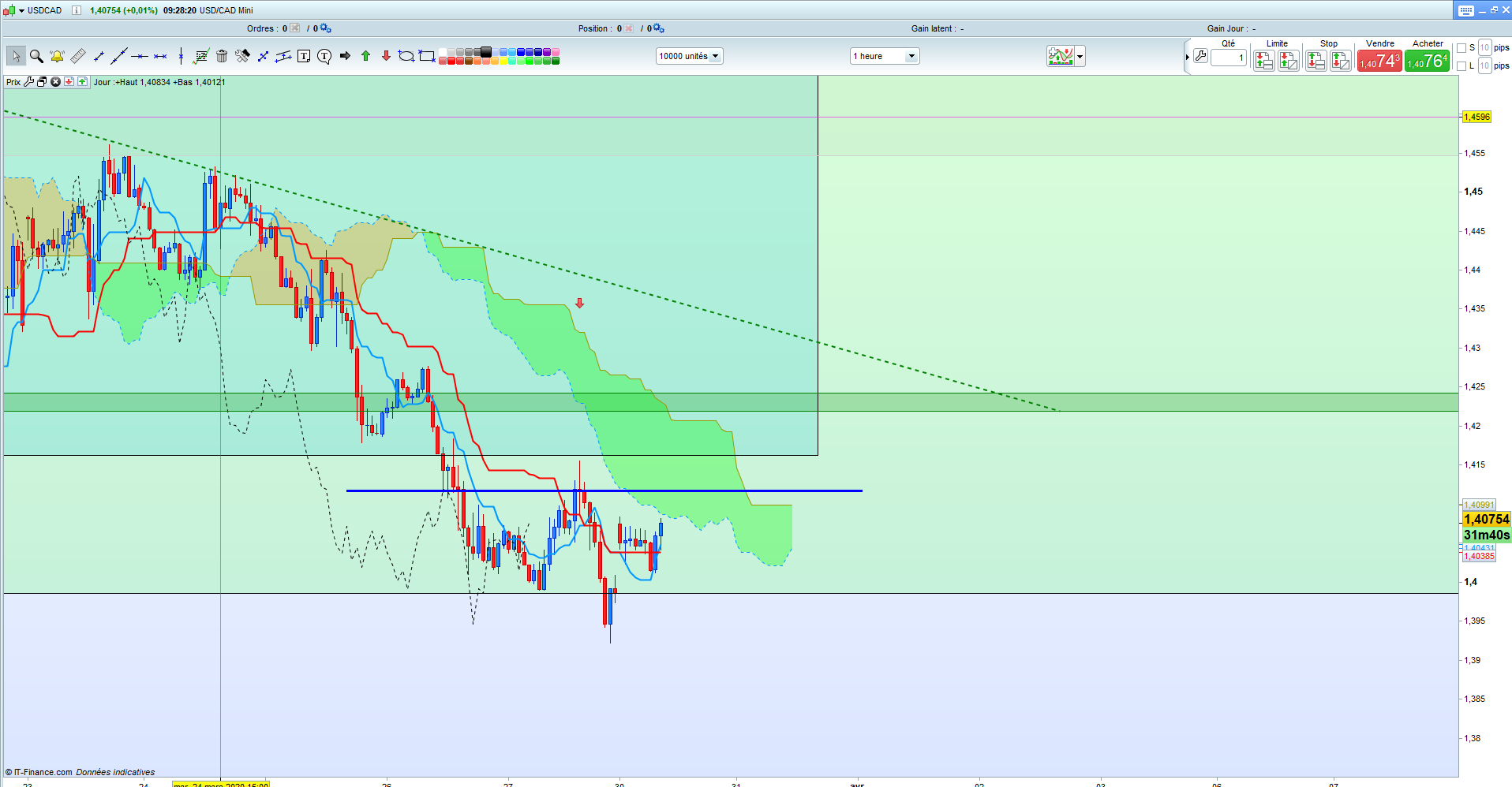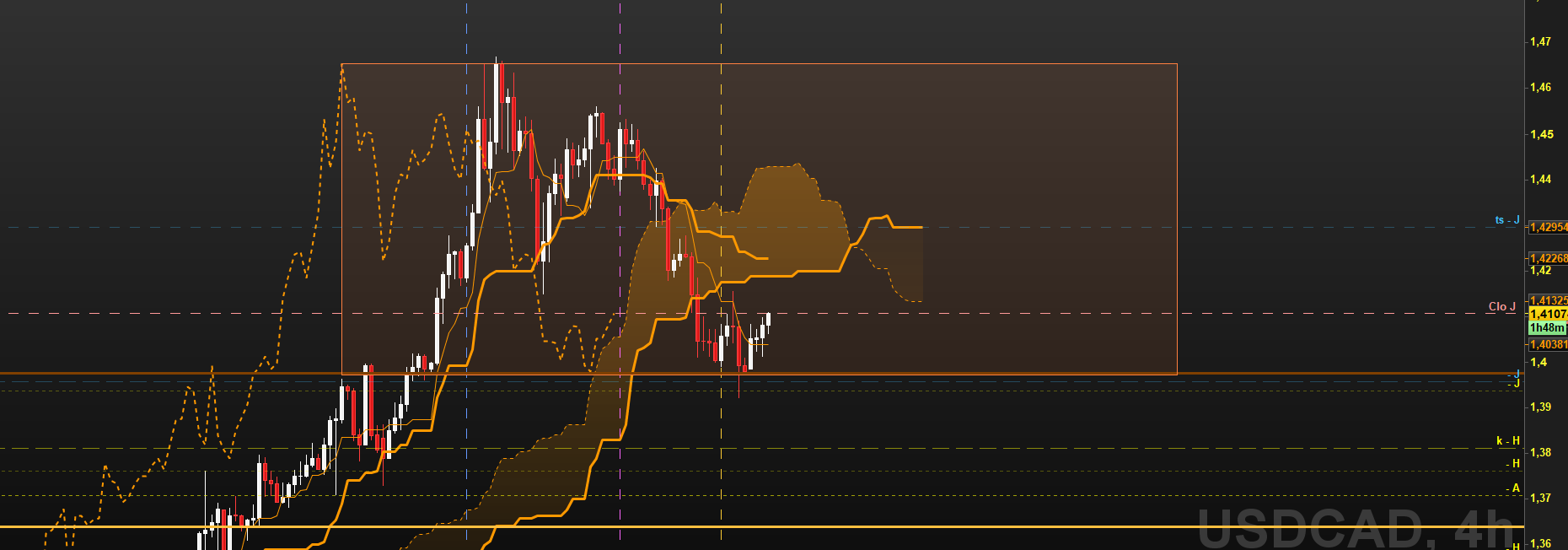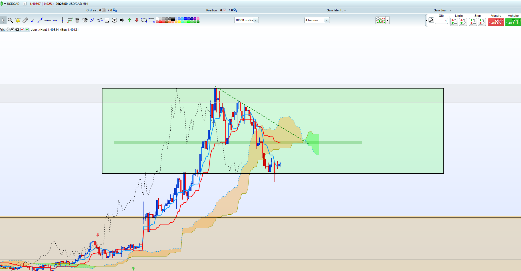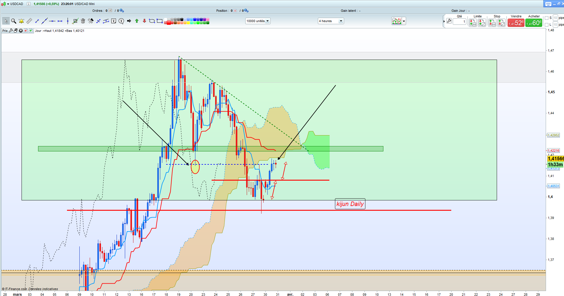 En H4, on retrouve les infos du daily avec la kijun daily comme bas de range et la tenkan comme ZE.