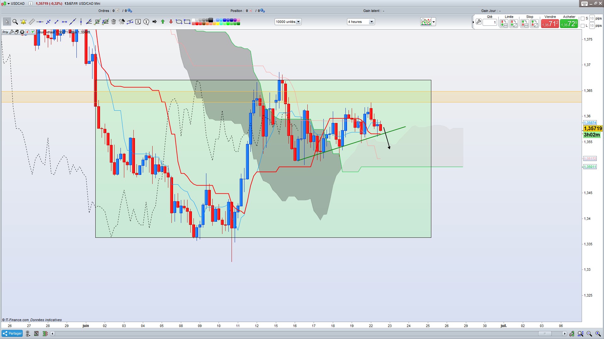 tenkan et kijun très proche, ( signe d'un retournement !) qui pourrait confirmer la baisse? à suivre