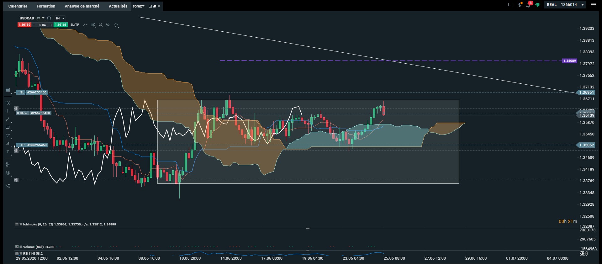 Attendre le pullback et rentrer en position pour un stop à 1.352 plat tenkan,et un objectif à 1.3500 , ratio bon et si de la ssb 4h deuxième objectif la ssb 1h à 1.349