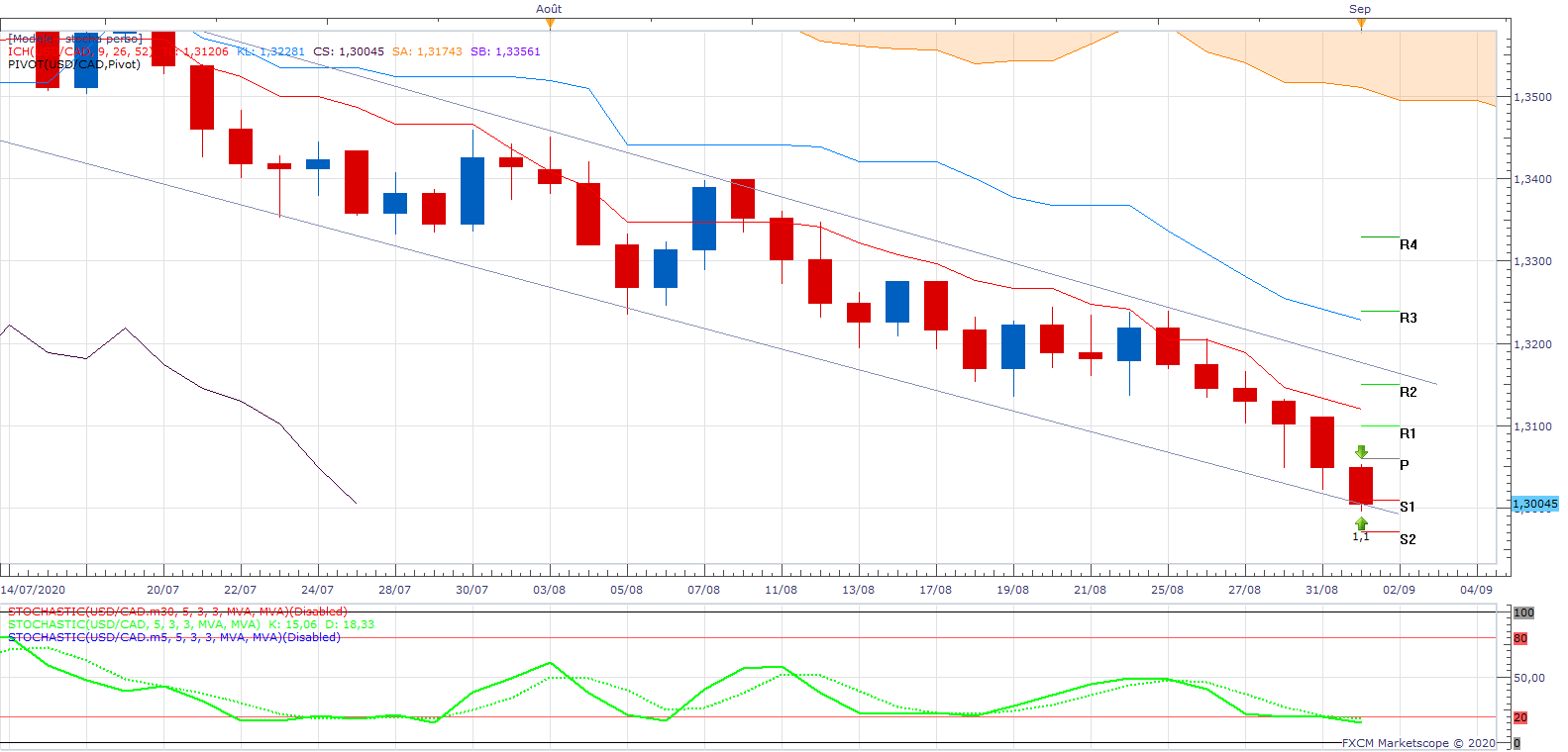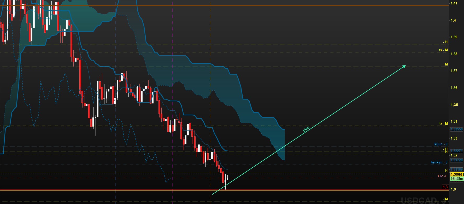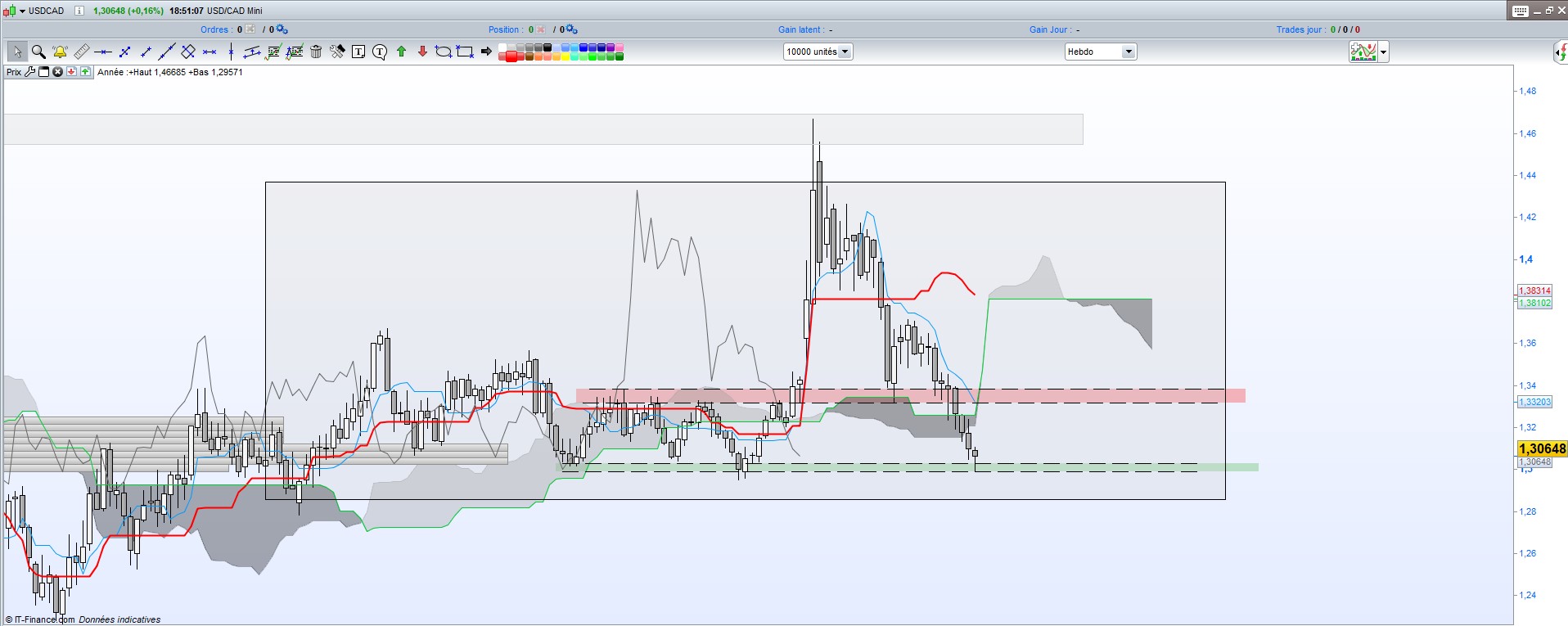 Quand même, j'ai outrepassé sur le fait de la survente hebdo, mais avec un bémol car la chikou hebdo vient de se liberer des prix ce qui nous incite à dire que les prix pourraient aller chercher le support plus bas, à savoir celui des 1.28.