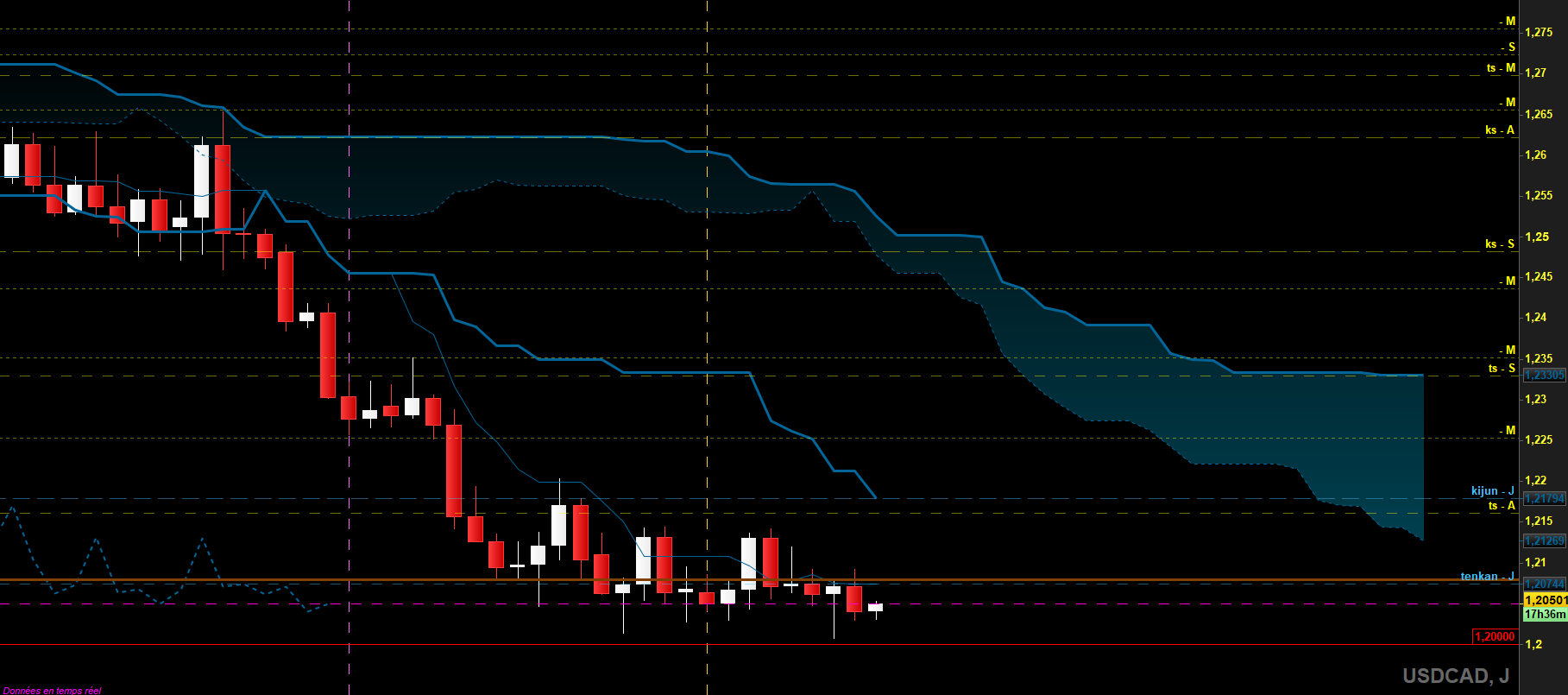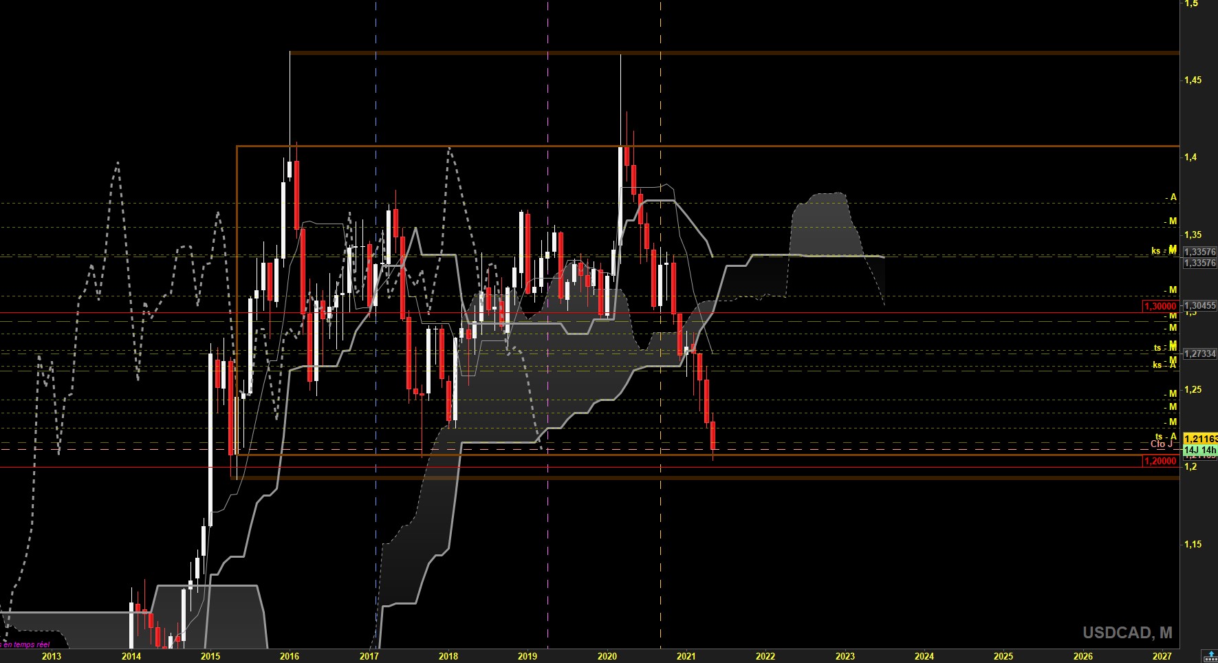 en mensuel, les prix sont en bas d'un range (dont je situe la borne basse à 1.208) avec survente. On note toutefois le niveau 1.2 très proche.