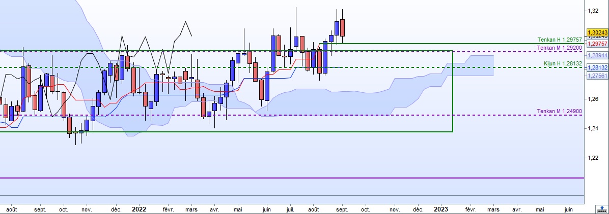 Range hebdomadaire cassé à la hausse, donc tendance haussière. Après la cassure de range, les prix sont revenus sur la Tenkan. La dernière bougie étant un avalement baissier, il est difficile d'acheter. Mais difficile de vendre vu qu'on est sur Tenkan. J'ajoute qu'on a une une bougie pied dans la porte qui a été repoussée par la Tenkan et la borne haute de l'ancien range hebdomadaire. Si les prix redescendaient plus bas que ça, ça invaliderait mon hypothèse haussière.
