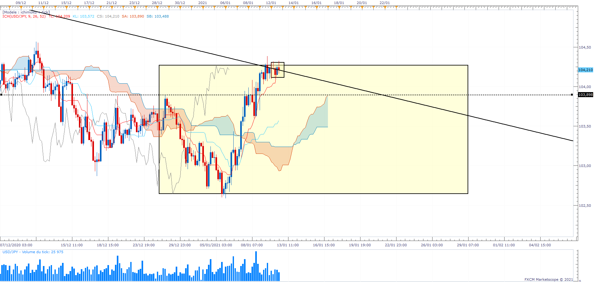 je vais contredire Guyme, mais si vous regardez les images que j'ai posté dans le lien, je vois des kumo daily et H4 baissiers et non plats.
