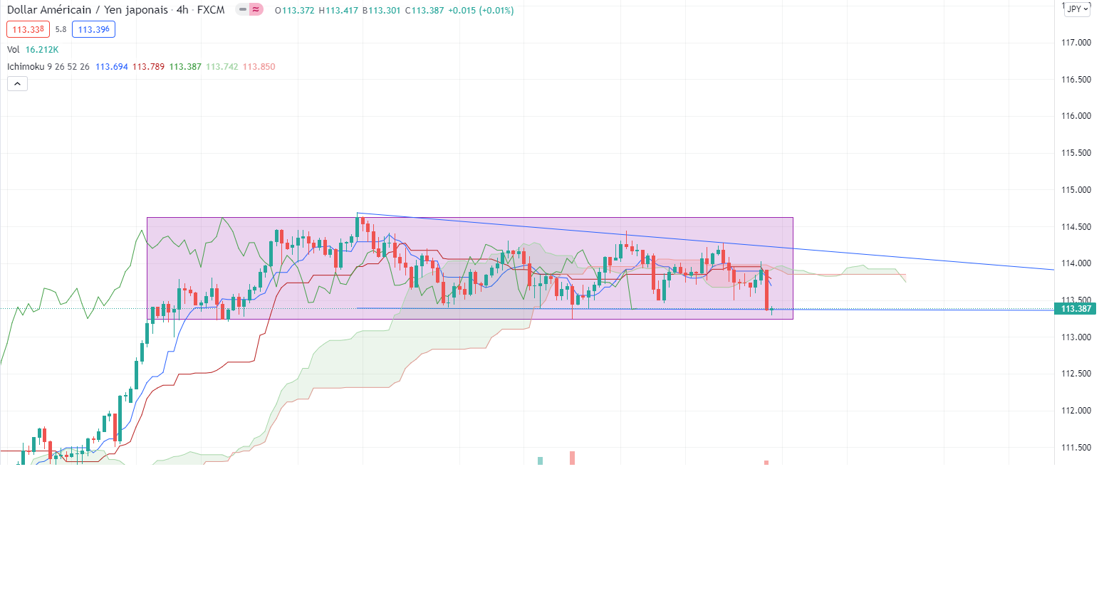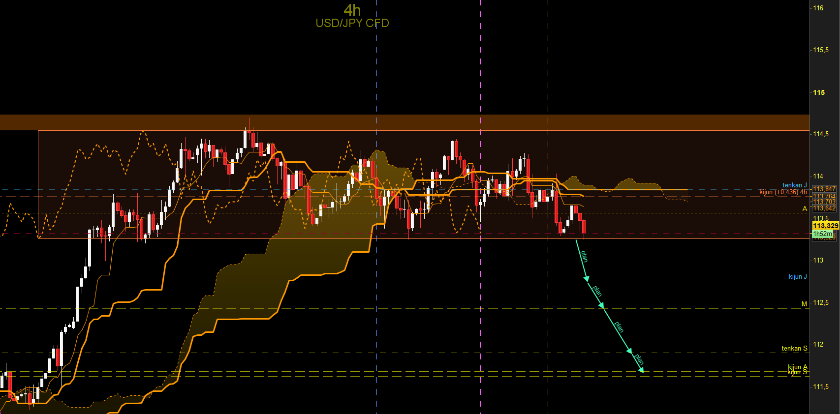 H4, le même range que Ichimoku35 qui est aussi cassé pour moi. Donc pour ma Target personnellement, je "joue" la projection du range. Avec comme objectif 1 le milieu de cette projection et après je vois si je "joue" la projection complète. Invalidation si kijun H4 casse.(ce n'est pas une règle en sois. Juste mon approche)