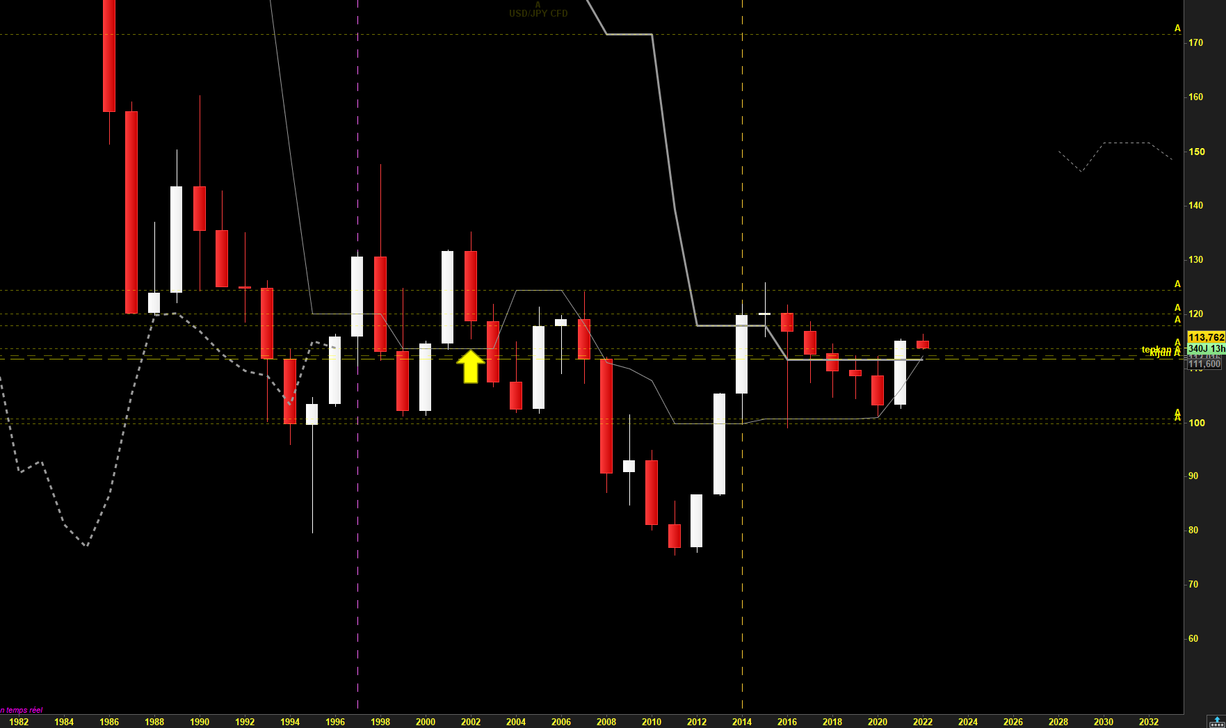 hebdo: tendance haussière, surachat, étoile filante il y a 2 semaines suivi d'un avalement baissier la semaine dernière. les prix travaillent la tenkan au contact des prix mais juste au-dessus de la zone de prix mensuelle précitée (comme en mensuel, je ne parle pas de chikou qui est libre). On note aussi les 2 pointes de mèches