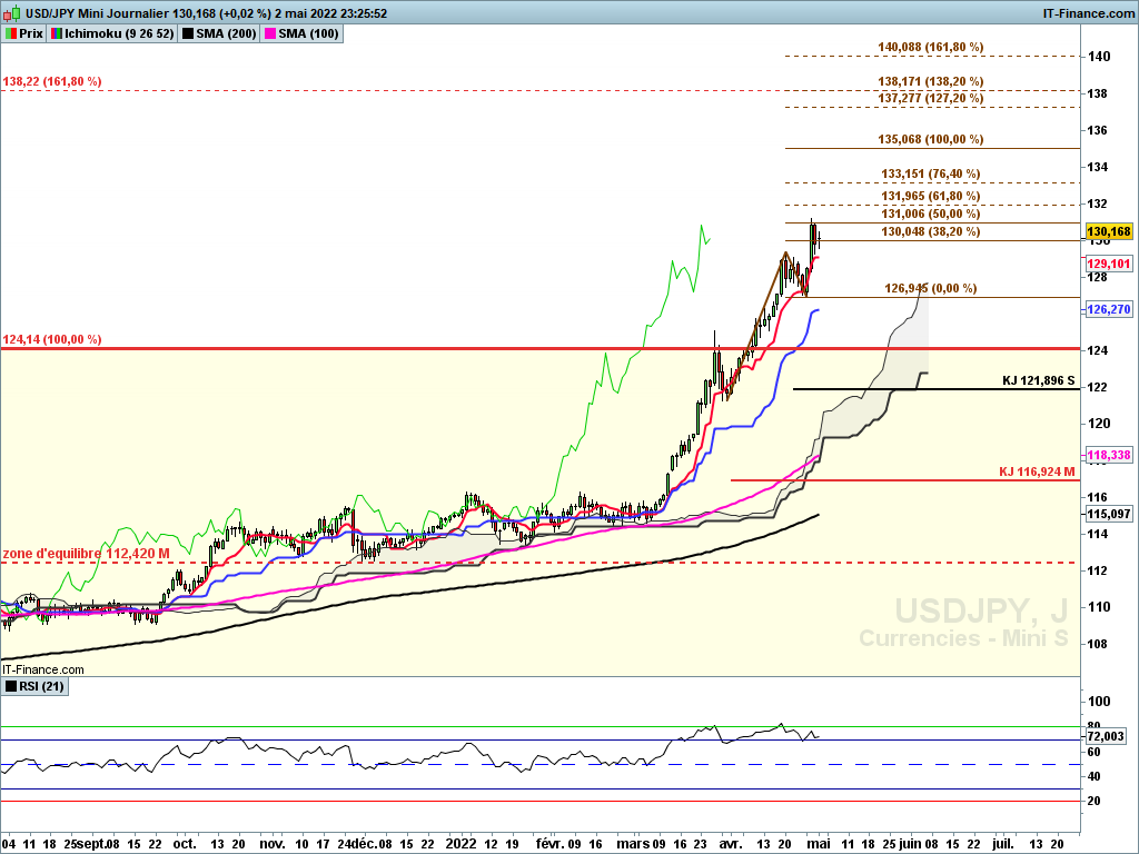 en daily, le kumo est haussier mais la tendance s'affaiblit clairement et si on ne peut pas encore parler de range, on voit parfaitement le double top (évoqué en hebdo) les prix sont au contact de kijun et chikou également, juste au-dessus du kumo et de la zone de prix mensuelle.