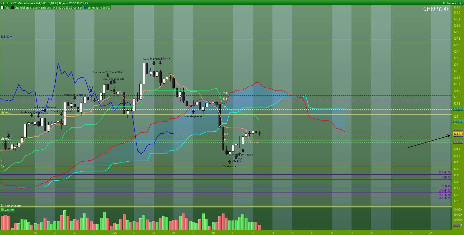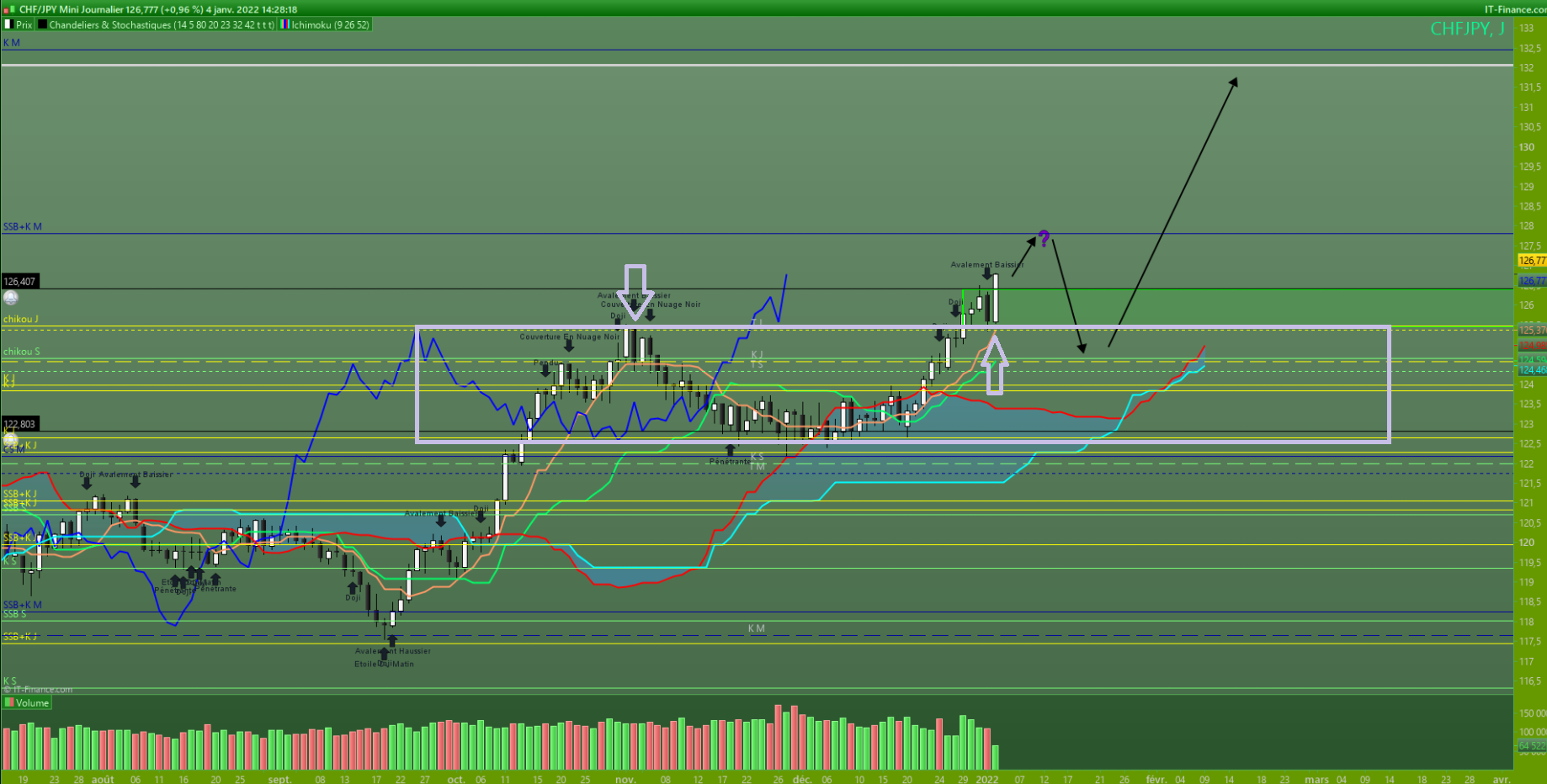 Prix supportés par la tenkan journalière mais cassé, pour les chartistes une ETE en cours de construction, je l'ai vu mais je en trade pas ce genre de configuration mais vu, les prix sont sur un niveau de prix en support depuis le 21/10/21, la tenkan journalière au centre de cette équilibre, kijun orienté baissière.