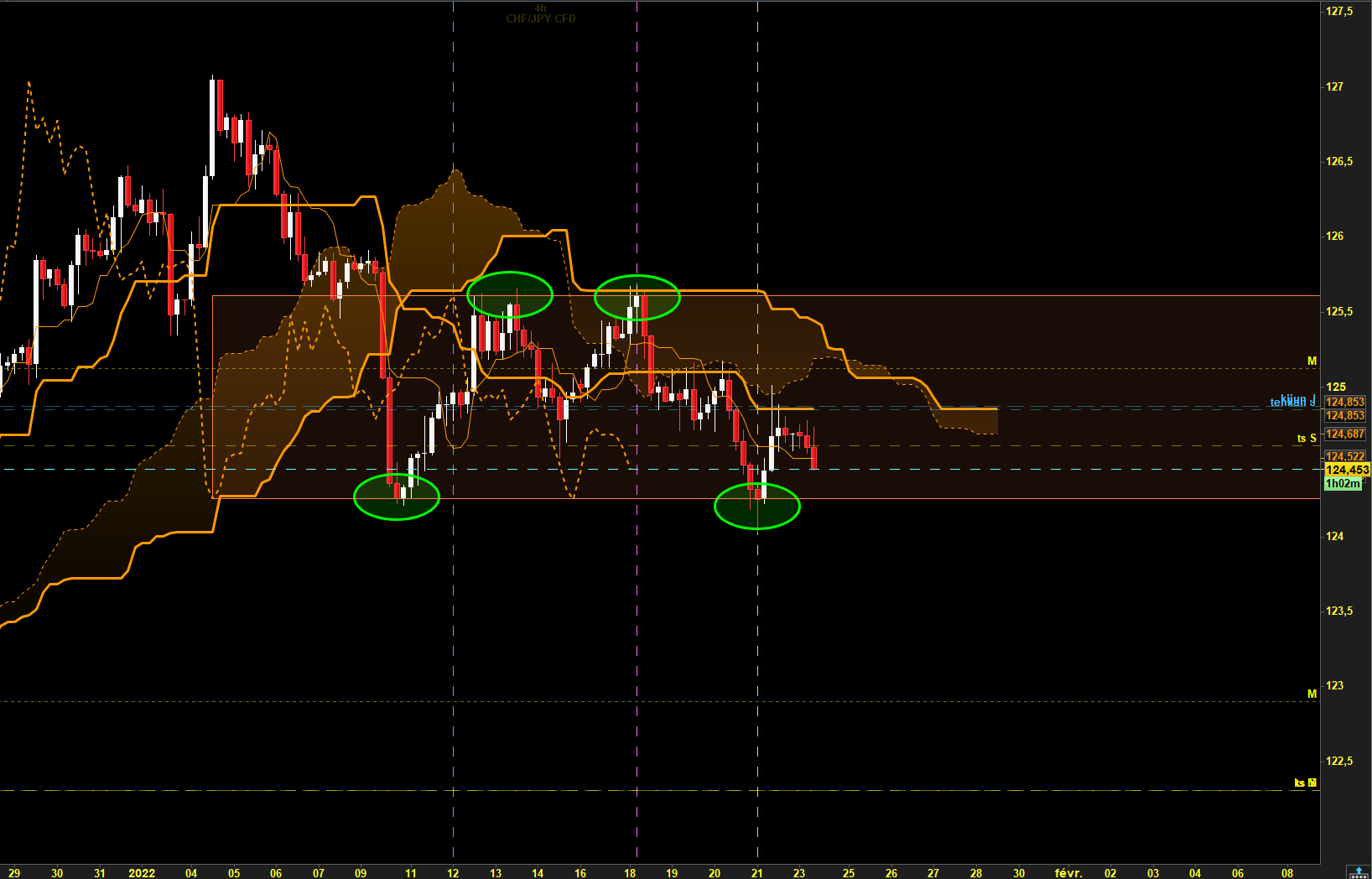 Chikou sur la borne basse de ce range H4 + les prix