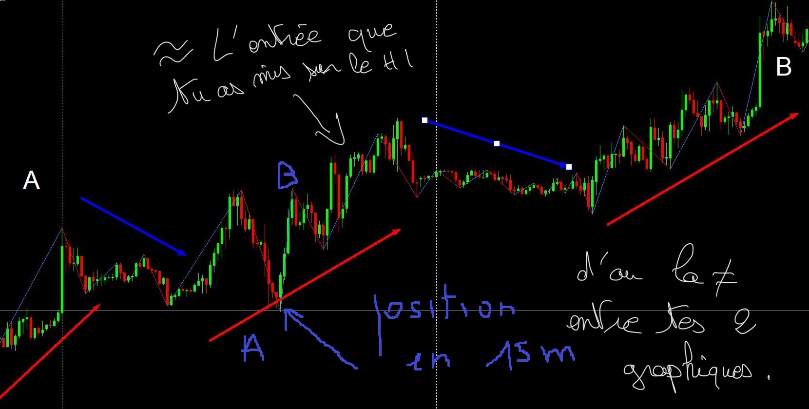 Effectivement j'ai beaucoup de mal à me situer dans l'espace temps . En revanche devant tes trois graphiques ( très bien dessiné et expliqué) je comprends très bien ou je me situe quand tu superposes le H1 et 15mm. Mais je bloque encore , si on reste toujours sur mon graph en 15mm comment sais tu ou je me trouve en ut h1 ??? tu ne peux pas superposer les graghs ??
