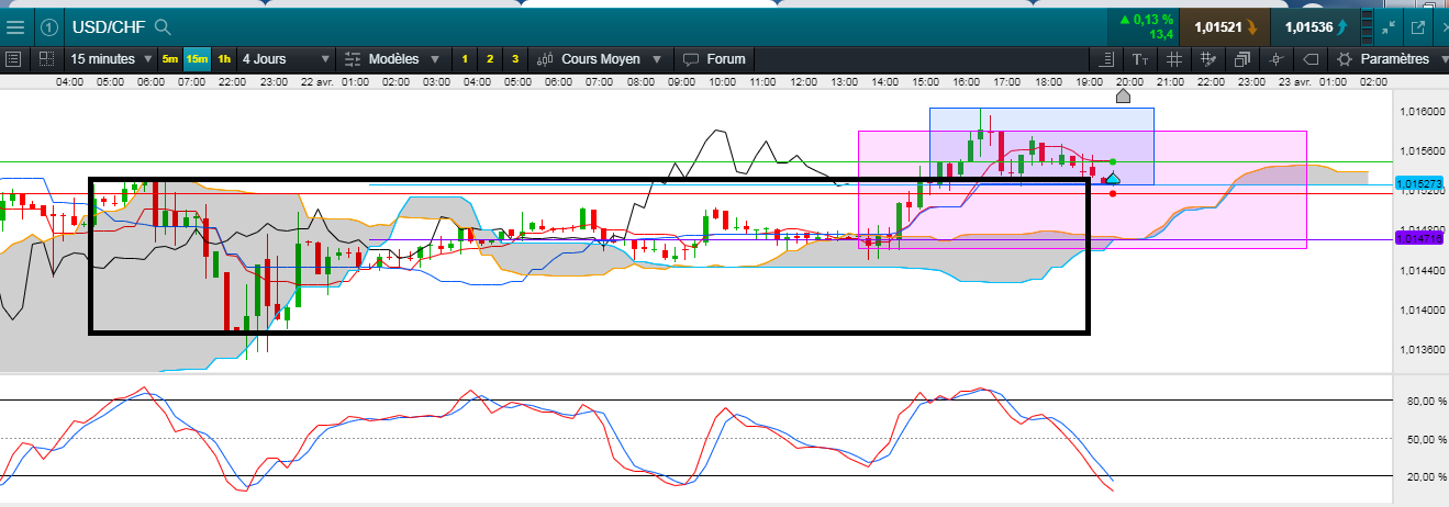 abfx a écrit:Bonjour, je vais être tatillon mais je ne suis pas d'accord avec toi sur une donnée m15 USDCHF: tu annonce "m15 en range". Selon moi, ce range (que j'ai tracé en noir) est cassé et la tendance m15 est par conséquent haussière. On a observé un throwback des prix sur l'ancienne borne haute/kijun. c'est une parfaite zone pour entrer long en cas de chandelier le signalant comme tu l'as fait.