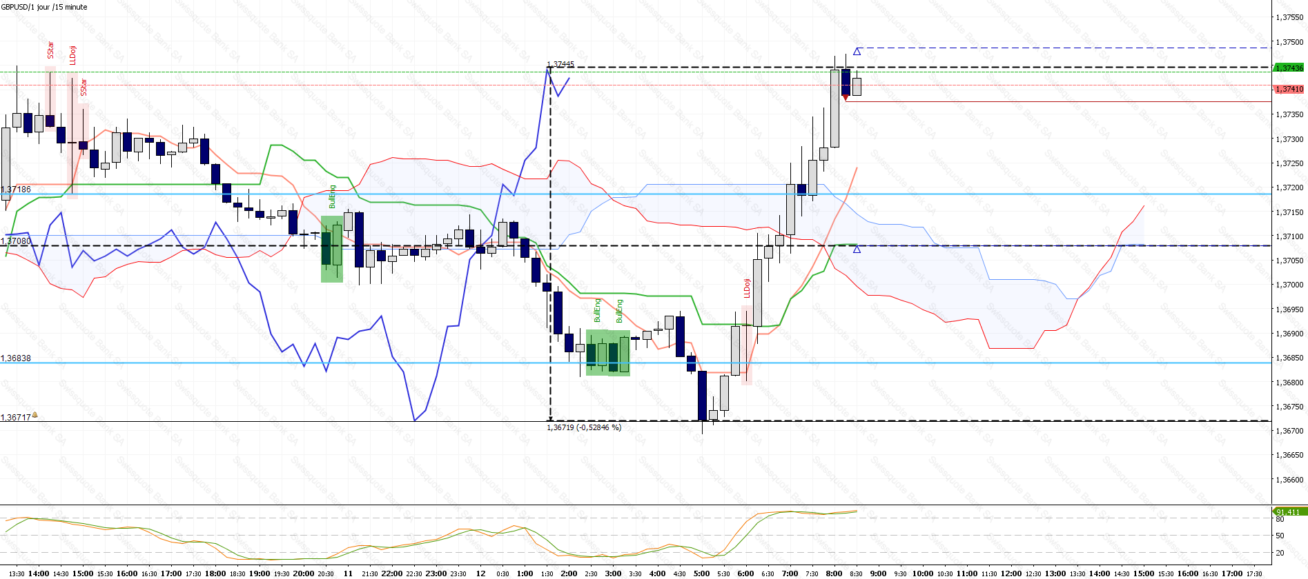 GBPUSD range quotidien retour des prix vers la BB : pas grand chose à faire mais je surveille. Si j'ai le temps je regarderai en UT inférieur un retour à la hausse vers la kijun H4 à 1.37935 nous avons un rebond sur un support en ce moment.