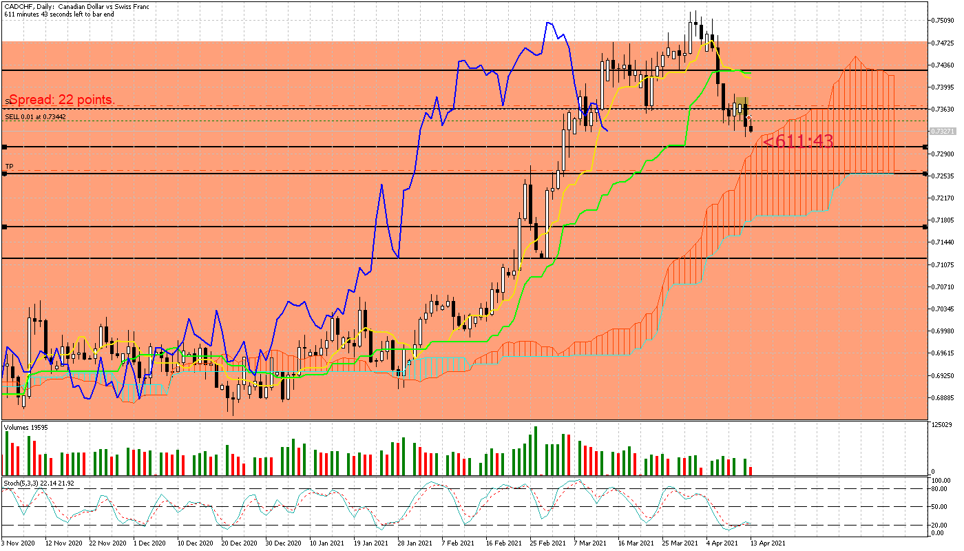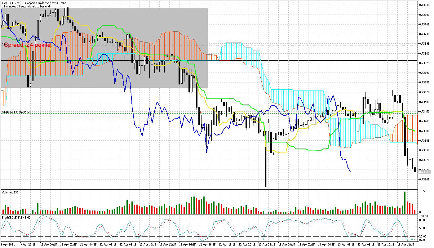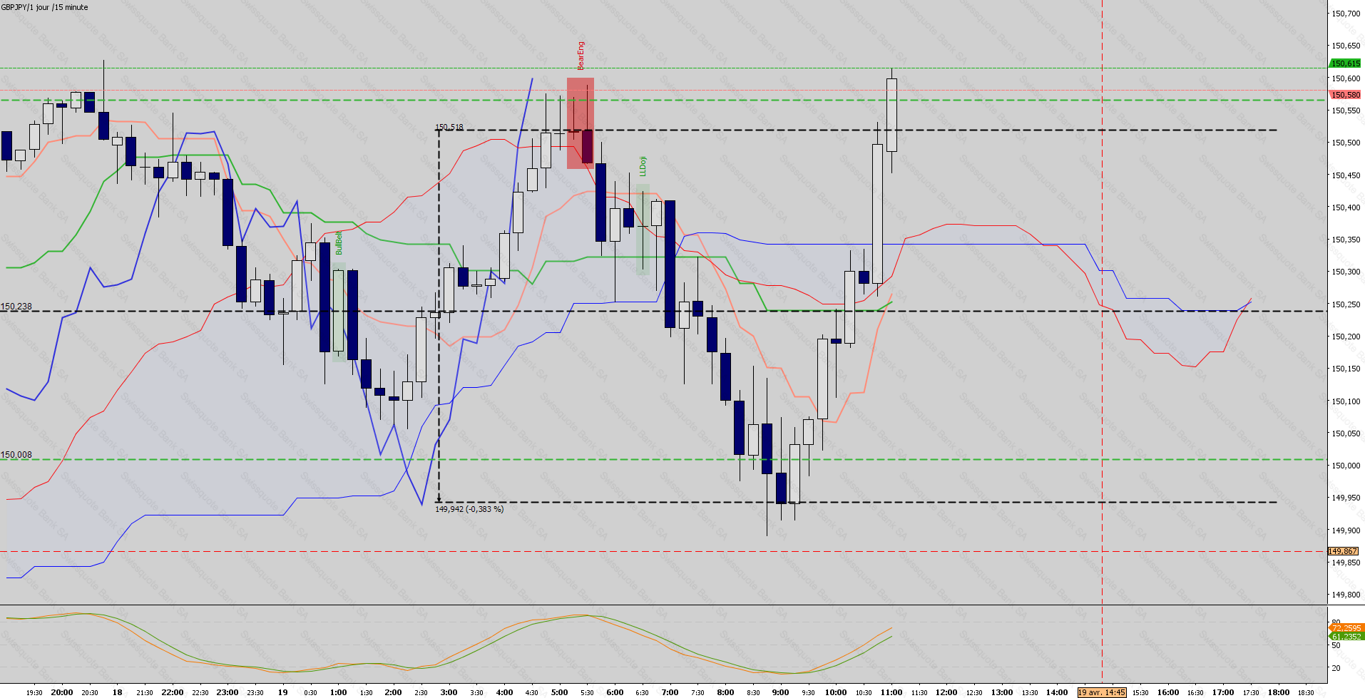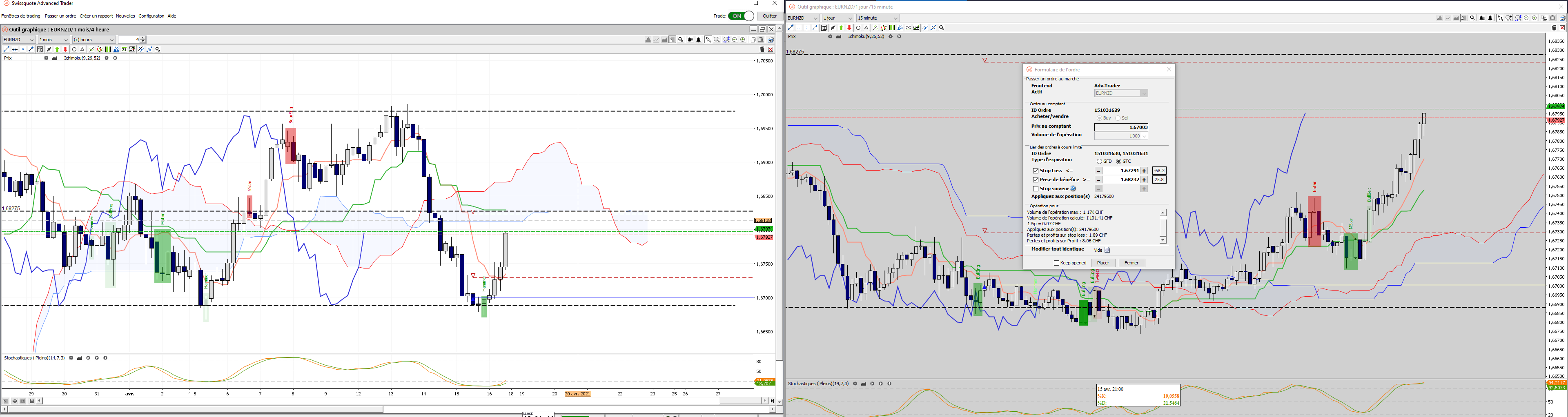 Bonjour à toutes et tous, entrée hier sur le CADCHF en M15 sortie de range, objectif la SSB quotidienne voir la kijun hebdo.