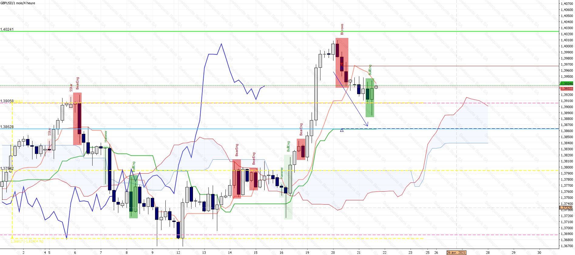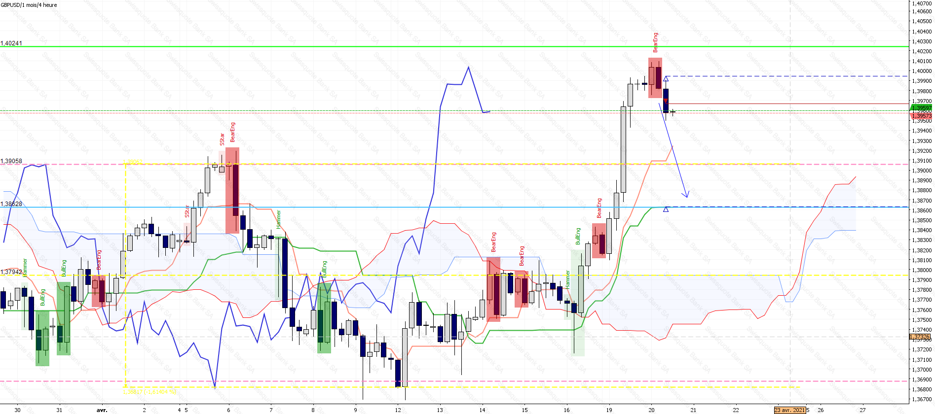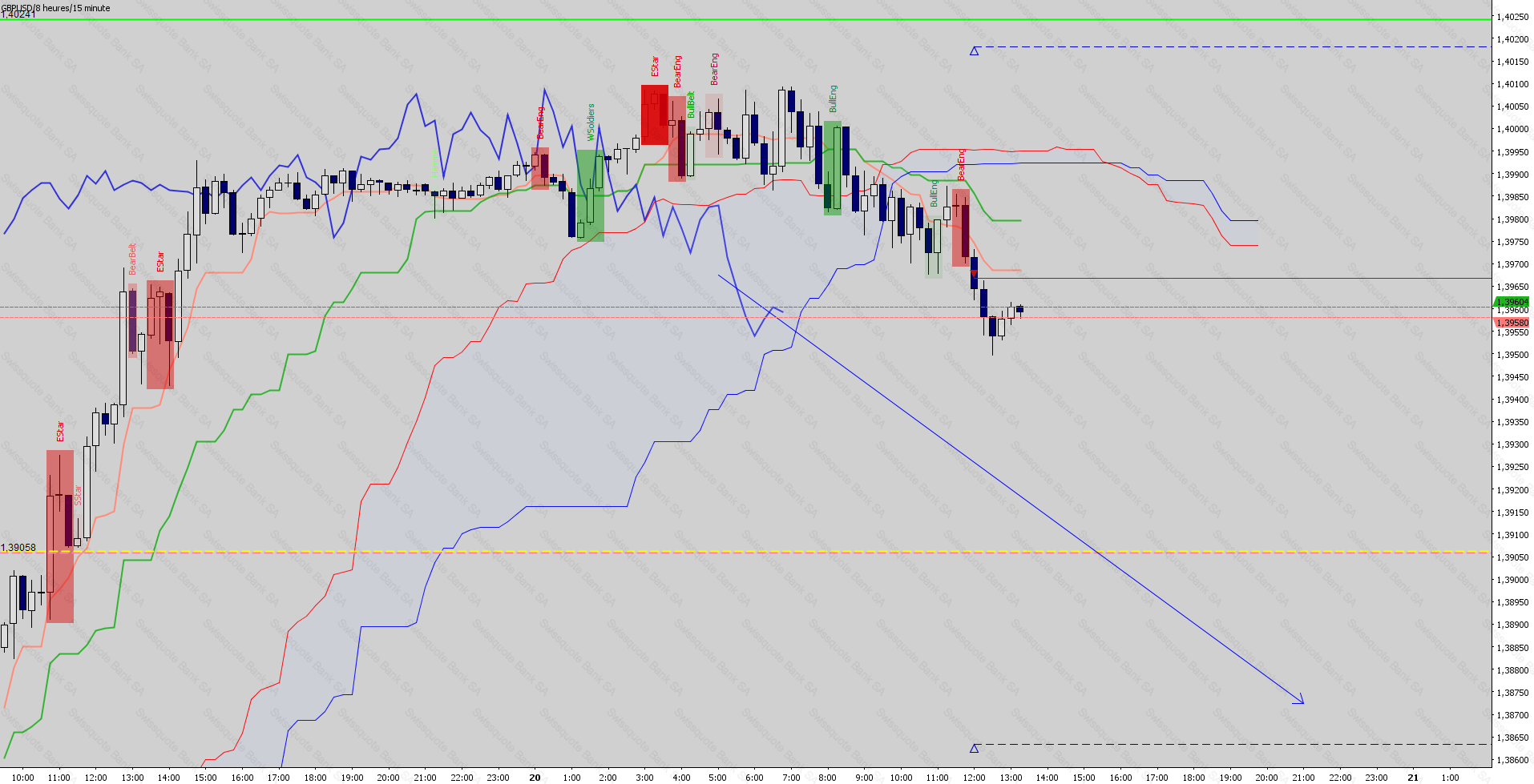 Bonjour Gavrik, ce trade gbpusd est magnifique: entrer en cassure de range de retournement m15 contre la tendance des UT supérieure pour trader le throwback: au top. On voit que les prix réagissent sur un niveau de prix que tu as signalé. Il est possible d'observer un pullback (qui est en cours sur tes graphs) vers la tenkan H4 avant de reprendre la baisse. Il est plus facile pour les cours de casser un S/R quand ils sont soutenus/appuyés par une ligne Ichimoku.