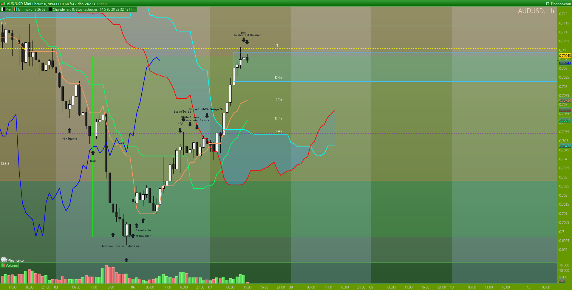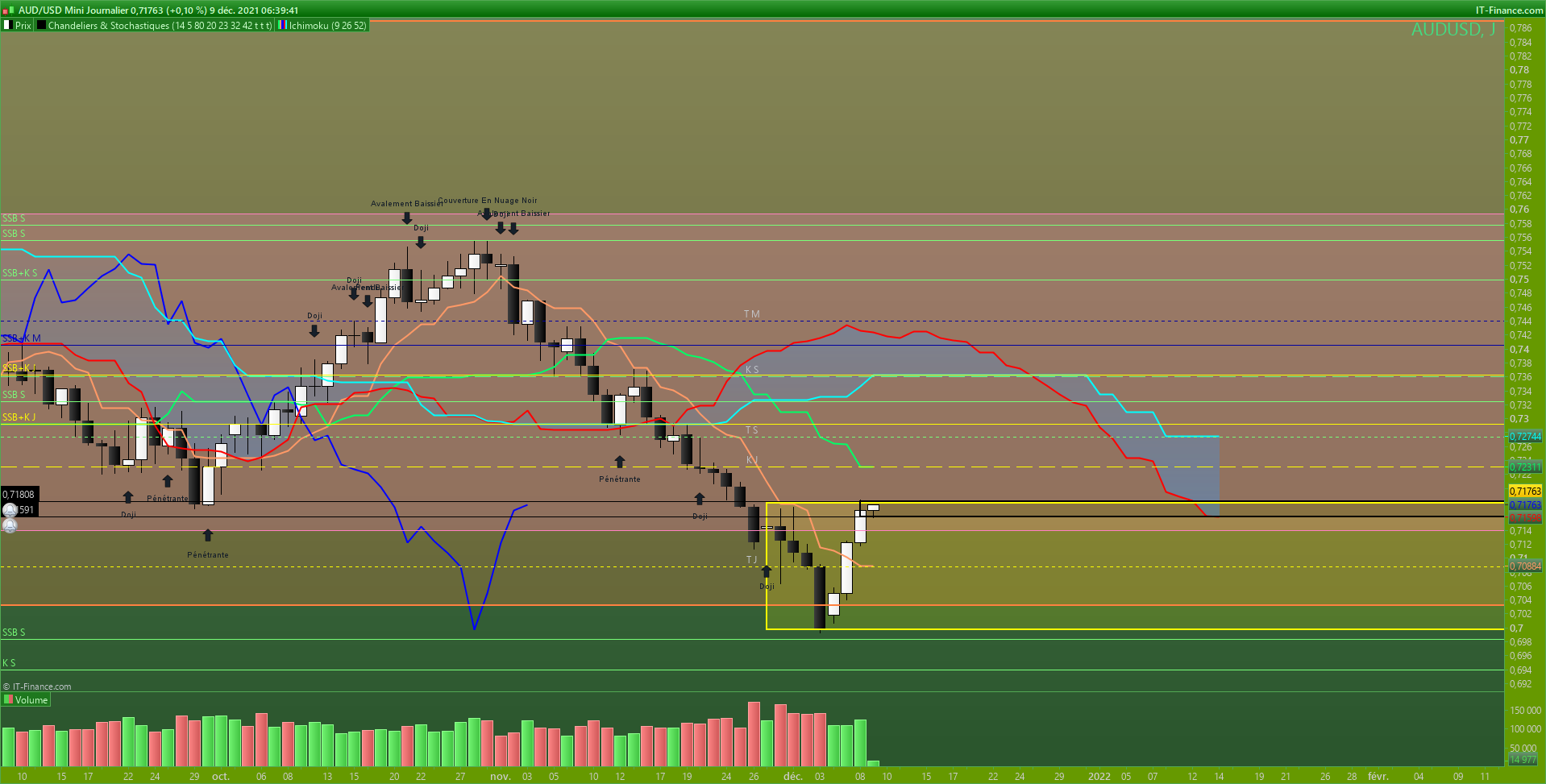 AUDUSD, suite d'hier, j'attend une confirmation après le doji pour entrer à la vente avec un beau ratio de 1/2 minimum vers la ZE H1, si mouvement baissier non confirmé je verrais pour un achat vers la kijun quotidienne