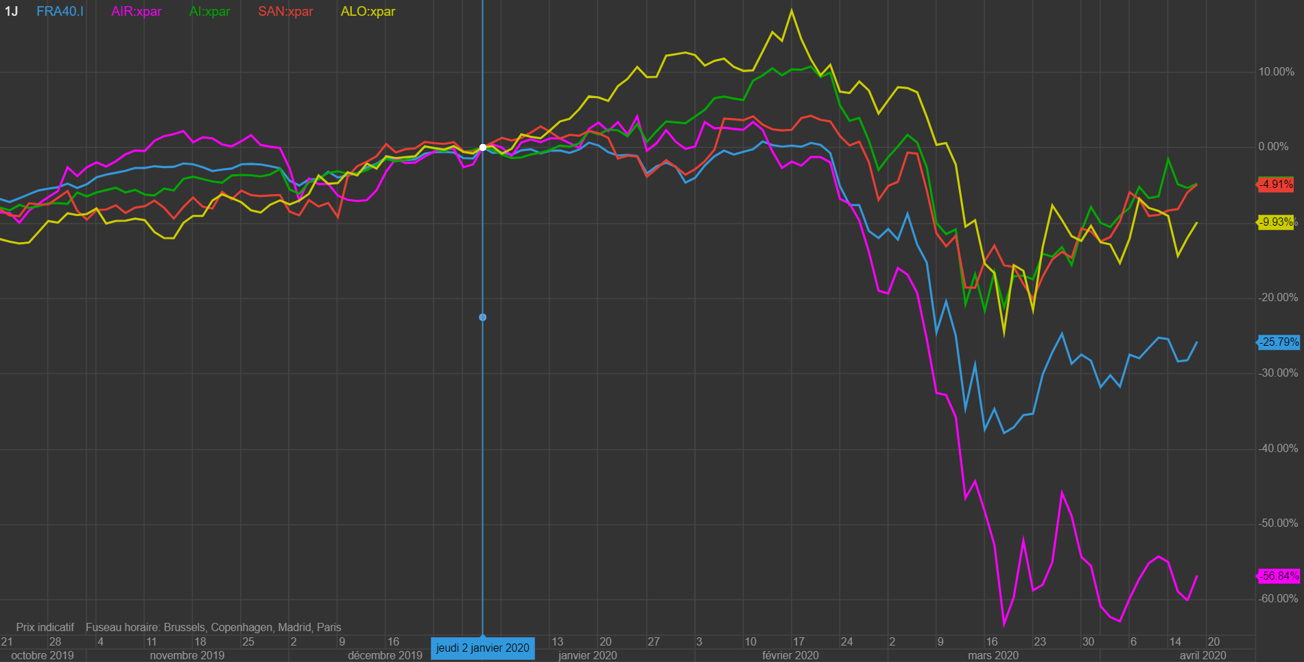 Bonjour Patrick,bonjour à toutes et à tous Y'a des actions qui résistent mieux que d'autres voir ci joint graphique des évolutions en % depuis le début de l'année de quelques actions et du cac:airbus;alstom,air liquide,sanofi