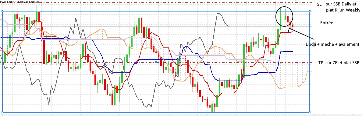 De plus en Daily les prix butent sur un gros plat SSB et en Weekly, on bute aussi sur la Kijun.