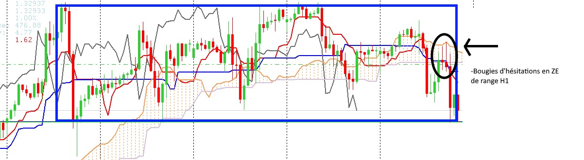 Ce qui m'a aussi poussé à prendre le trade, pour jouer cette respiration c'est que quand j'ai pris le trade, on avait une cassure par le bas d'un range H1.