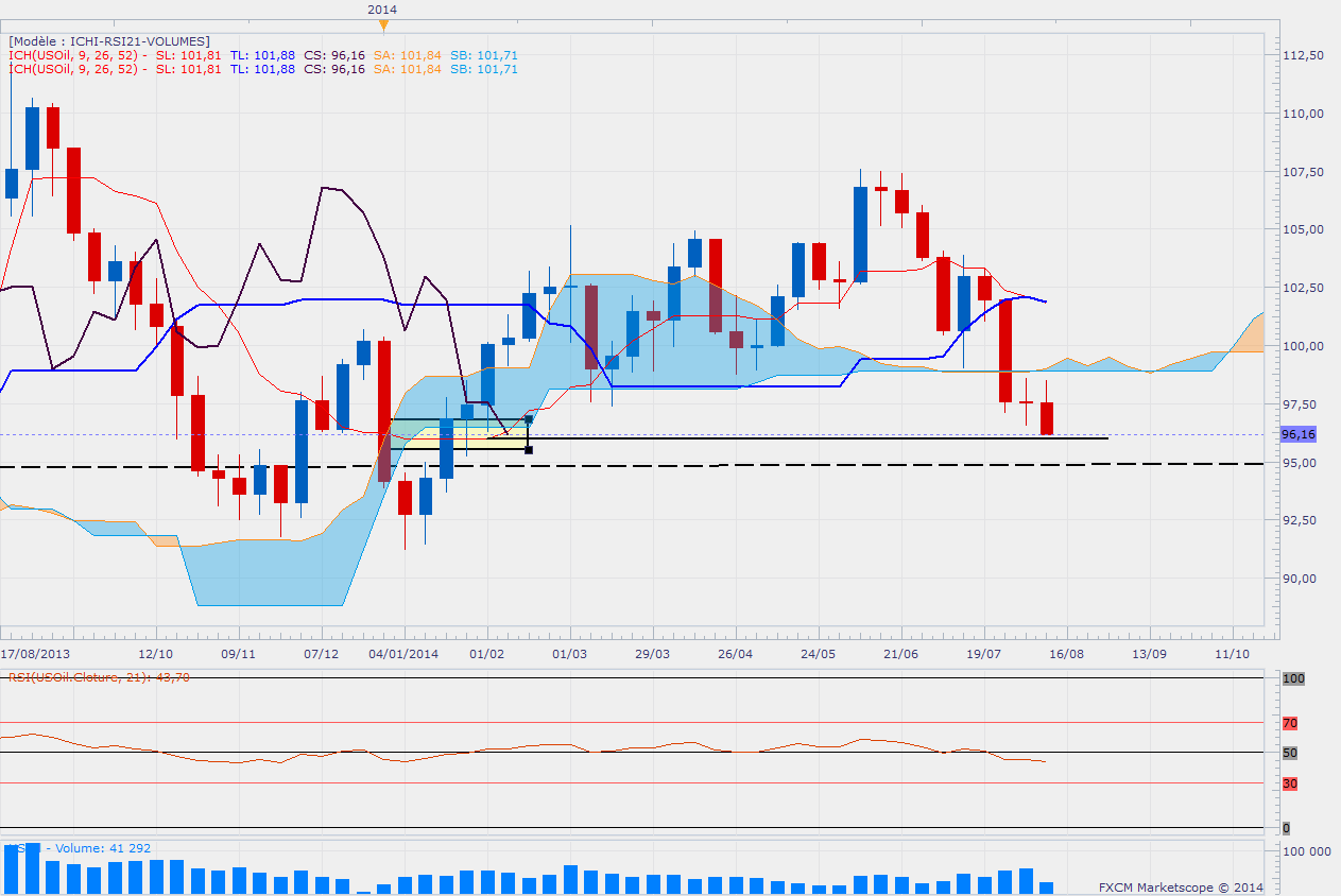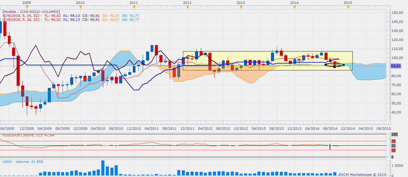 Le pétrole (USoil) WTI est en range long terme comme le montre le mensuel. La cloture c'est faite sous la zone d'équilibre. Par conséquent la probabilité d'aller chercher le bas du range est forte.