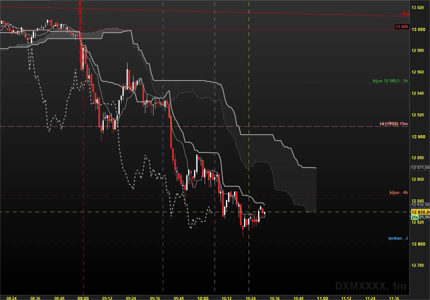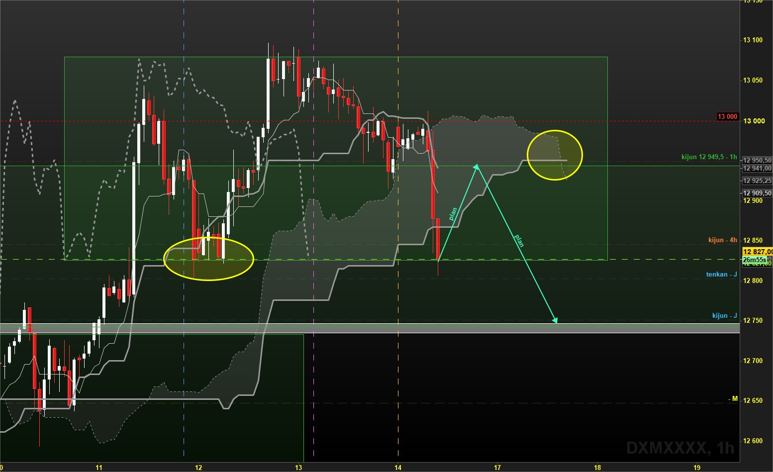 En H1, les prix ont cassé le dernier plus haut en absolu mais cette tentative de casser la zone de résistance que j'évoque depuis plusieurs jours autour de 12750 s'est avéré un échec et les prix ont réintégré le range avec une pénétrante qui a cassé la kijun: là aussi: échec dans la hausse et signal baissier