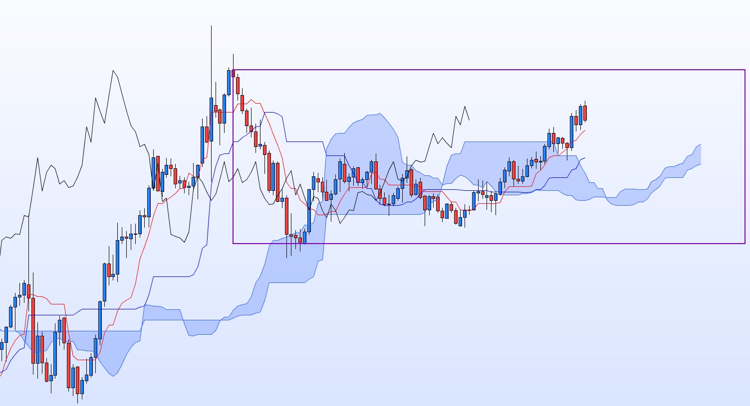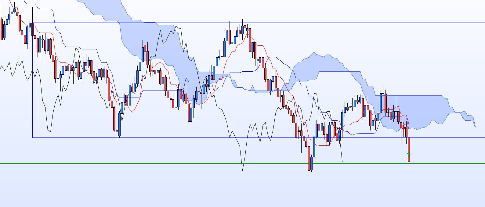 On est dans un range hebdomadaire. Les prix sont venus chercher la borne basse, et ont été repoussés par la Kijun. Ils sont en train de chercher à passer la Tenkan.