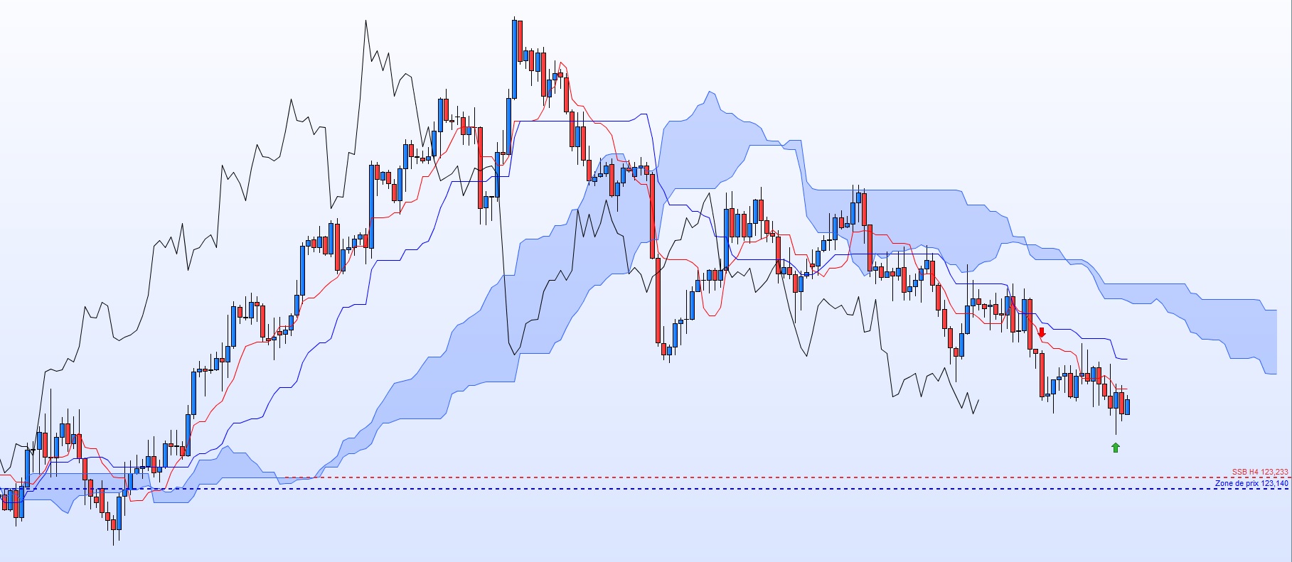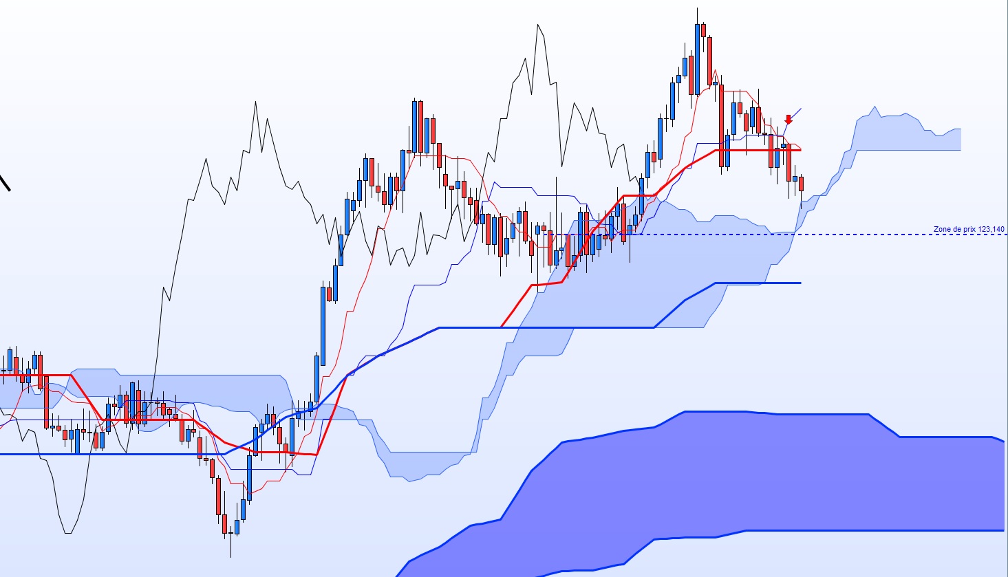 Les prix se dirigent vers une zone de prix journalière à travers le Kumo. Sinon, on est assez proche de la Tenkan, ce qui est plutôt bien pour vendre.