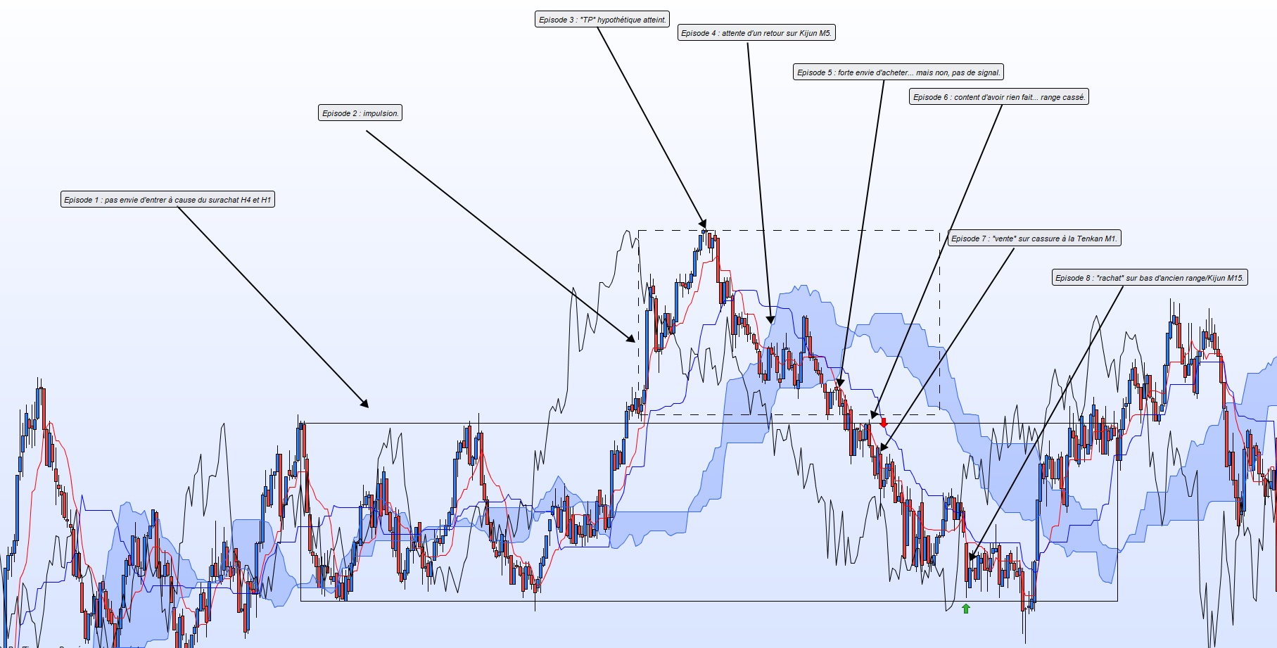 On rappelle l'existence d'un ancien range journalier, qui a été cassé à la baisse, puis réintégré. Les prix ont buté sur la ZE du range qui correspond à la Kijun hebdomadaire, on est donc en droit de considérer que l'ancienne borne basse n'est plus un obstacle et qu'on est en tendance baissière. En revoyant mon post, je me rends compte que la Chikou est dans les prix, que je l'ai vue et que ça ne m'a pourtant pas arrêté. Je ne me rappelle plus pourquoi, cependant...