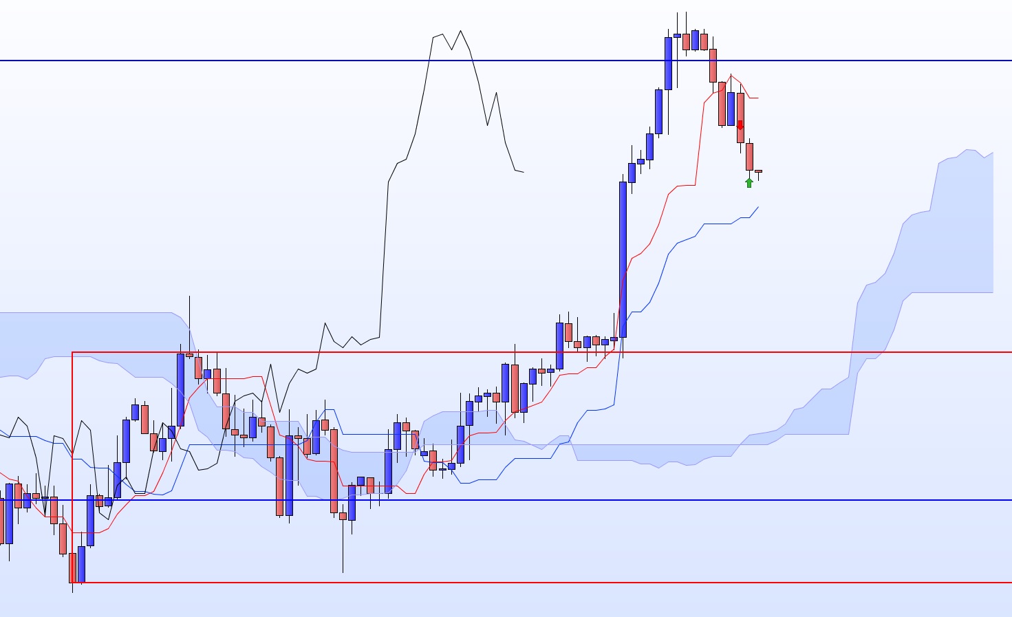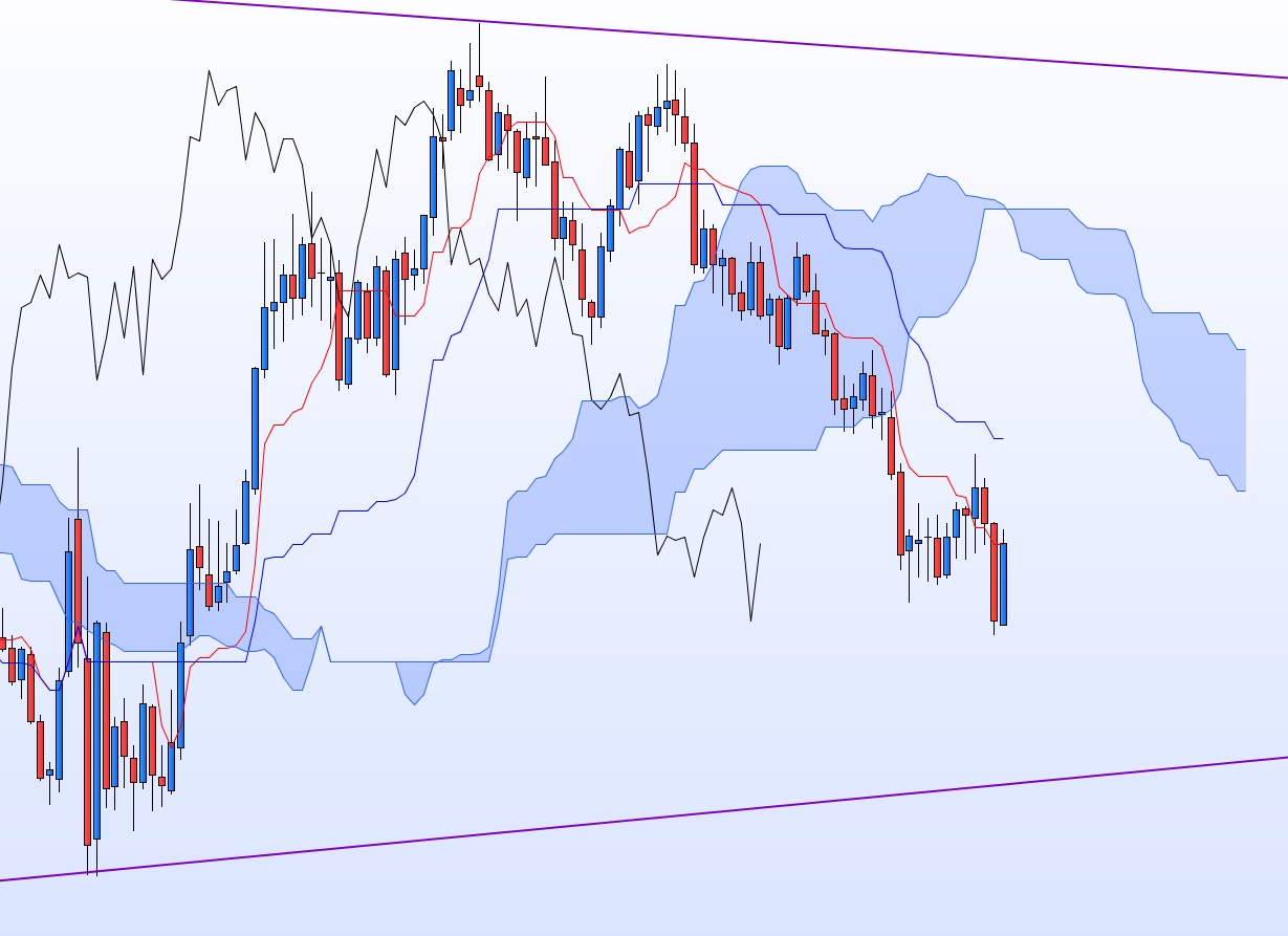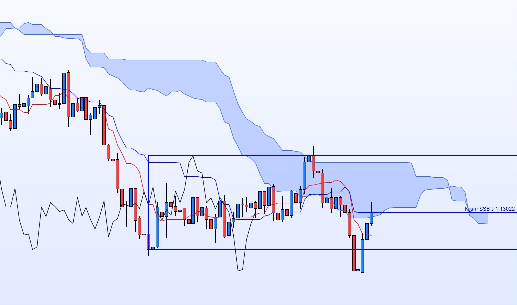 On arrive sur des résistances sur plusieurs UT (Tenkan hebdomadaire, Kijun journalière, ancienne Kijun et SSB H4) après une cassure de range journalier par le bas, et dans un mouvement de fond baissier.
