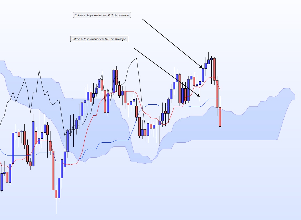 Journalier : la Tenkan hebdomadaire correspond à la Kijun journalière. Les prix ont cassé à la baisse la Tenkan journalière, ce niveau de Kijun est donc maintenant l'objectif logique.