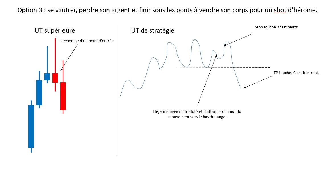 Stop : au-dessus de l'ancien plus haut... on peut discuter de savoir s'il aurait fallu le mettre large au-dessus du range H1. Mais ça ne semble pas débile non plus, dans la mesure où la cassure du range signifie qu'on relance la tendance, on n'est donc pas censés passer l'ancien plus haut.