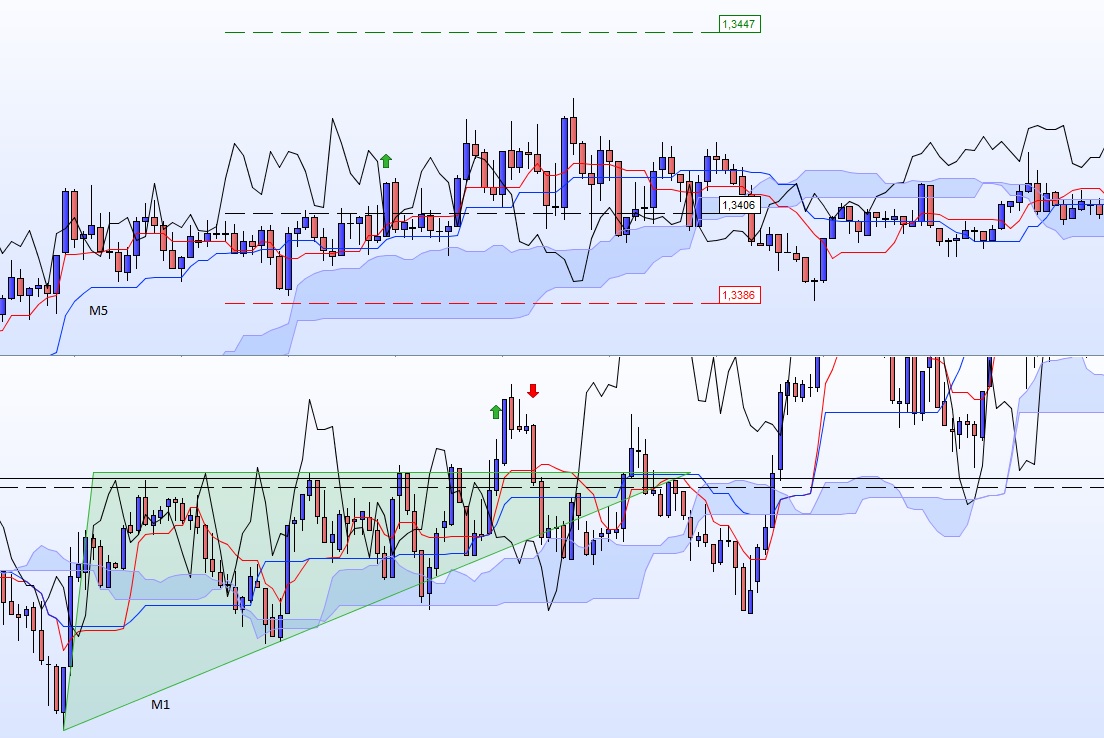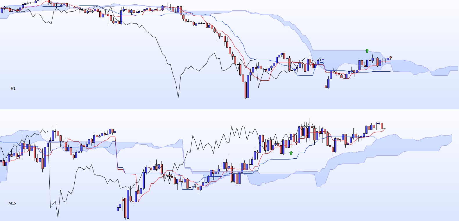 H1 : cassure à la baisse d'un range H1, pull-back sur le bas du range. J'entre lorsque la couverture en nuage noir commence à se déployer. Plus précisément, juste après l'avalement en M15.