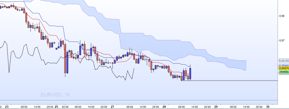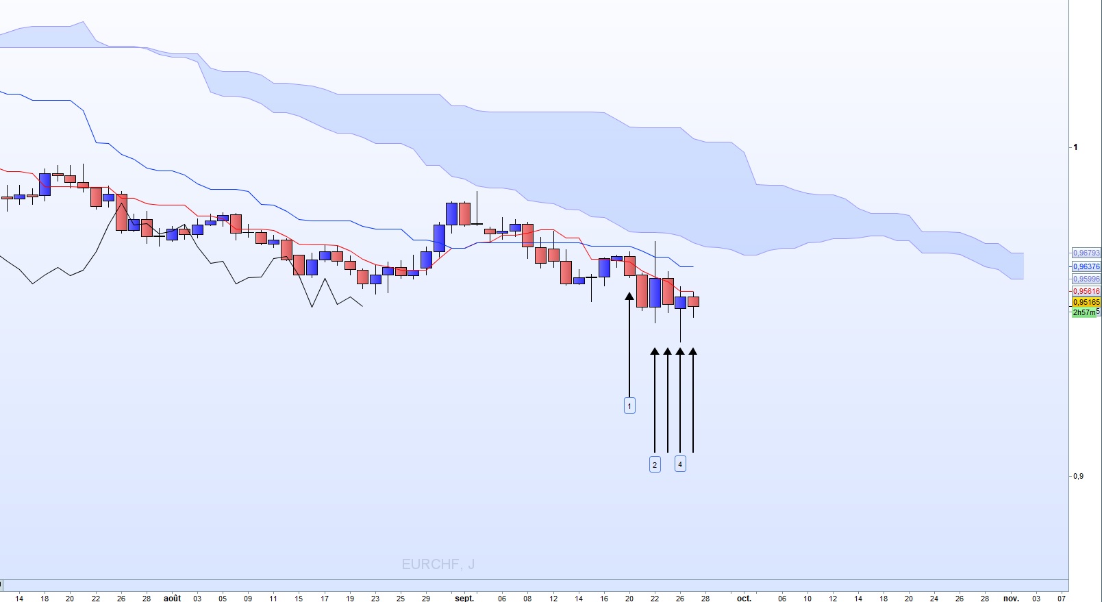 Exemple :On peut commencer à surveiller la bougie 1, qui coupe une Tenkan inclinée à la baisse (mouvement que je catégorise comme "accélération baissière en tendance baissière").