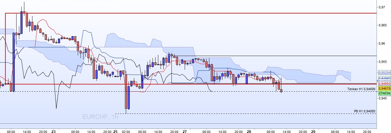 EURUSDH1 :La tendance de fond est haussière. Plus intéressant, on voit que les prix "préparent" une cassure d'une zone de prix H1, avec un schéma bien connu : attaque de résistance/retour sur Kijun/attaque de résistance/retour sur Tenkan. Je considère donc que nous sommes au début d'un mouvement haussier.