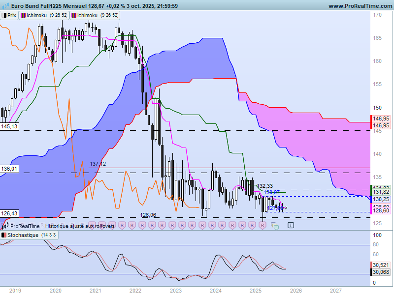 Le contrat Bund est maintenant sur l’échéance décembre 2025. Cela a eu pour conséquence de faire bouger les supports et résistances sur les unités de temps les plus longues (voir l’explication de la semaine dernière). Ainsi, les supports de long terme se situent dorénavant sur 126.01 et 126.43 alors que les résistances sont sur 136.01 et 145.13.
