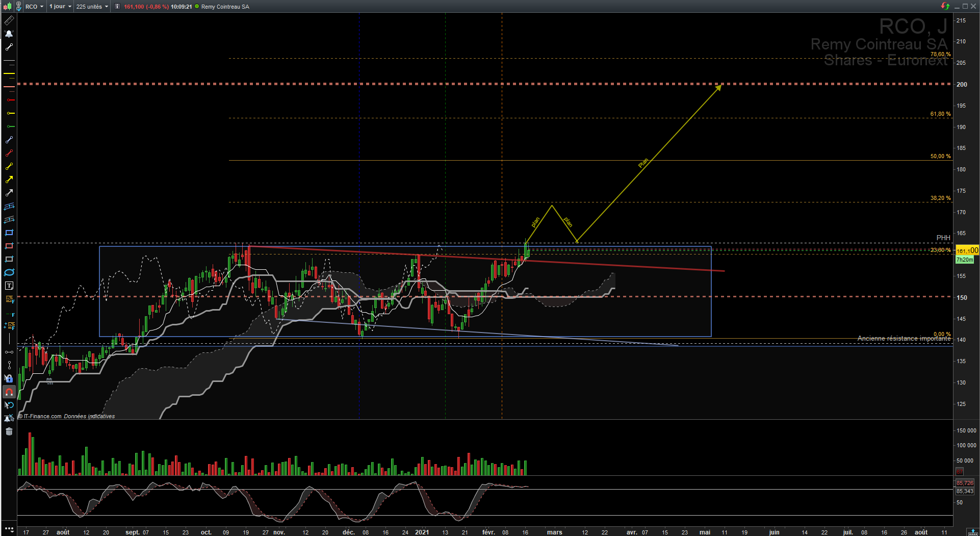 - Attendre un signal franc d'extraction des prix, pullback sur BH du range D et remontée de Ks avant d'entrer Long et de viser le niveau symbolique des 200€