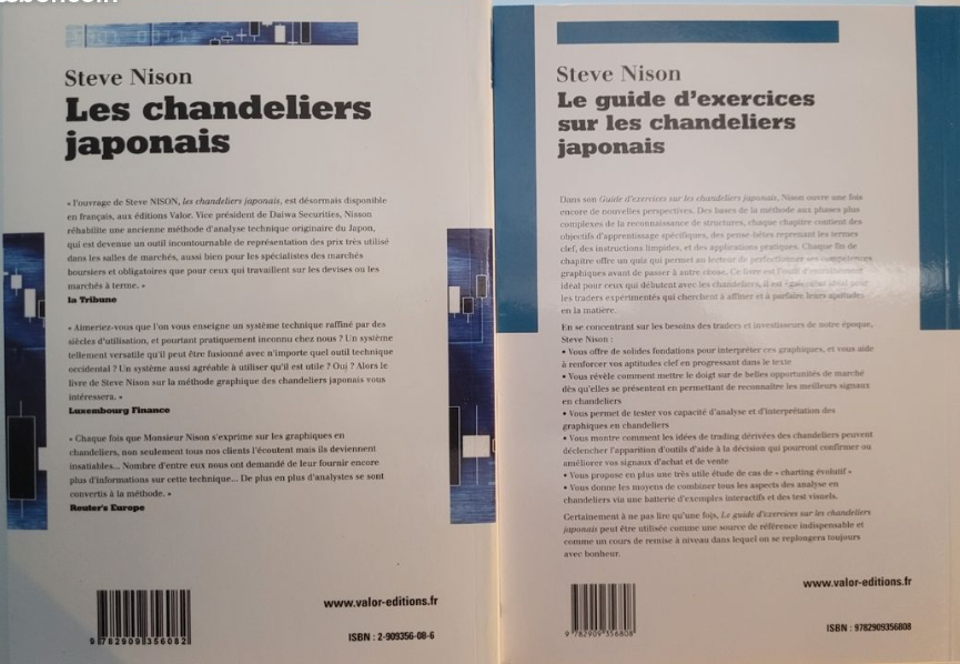 Bonjour à tous, si ça peut intéressé certains d'entre vous, je vends la bible des chandeliers japonais: "les chandeliers japonais" de Steve Nison" et aussi le "guide d'exercices sur les chandeliers japonais" également de Steve Nison.