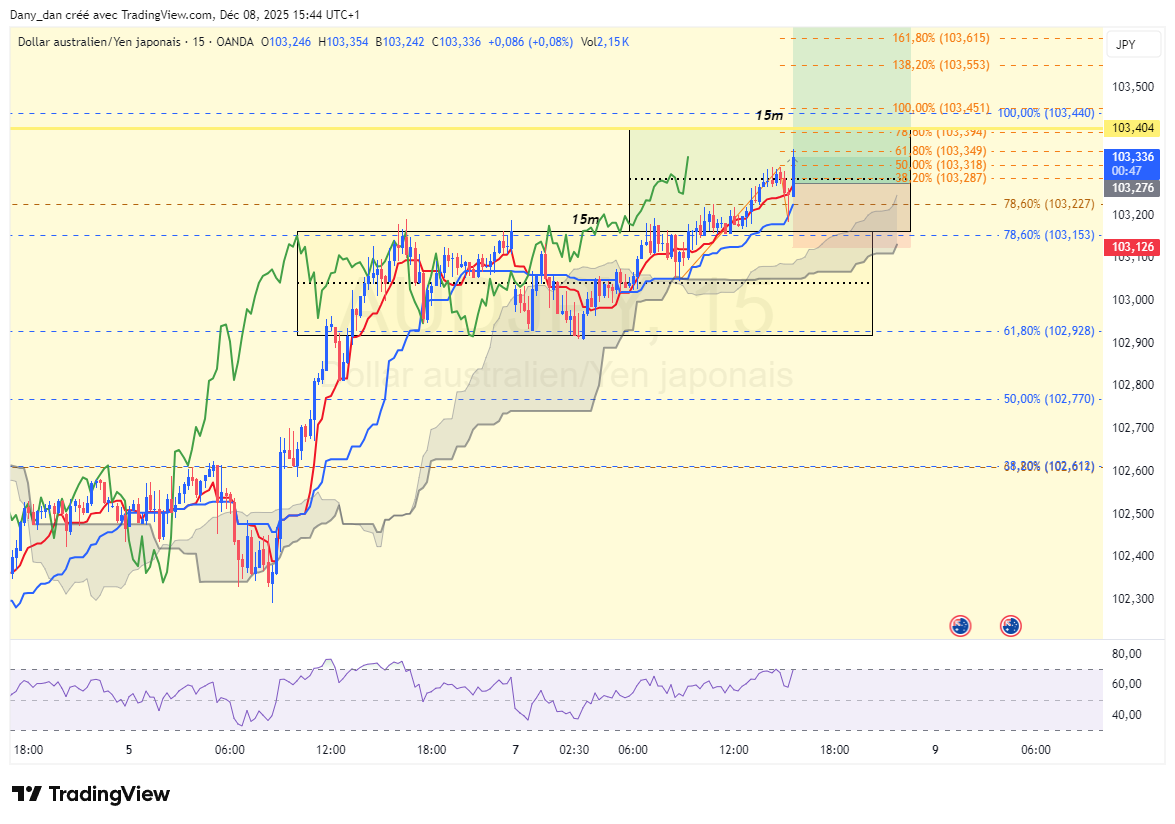 En 15m, il y avait un range qui est sorti par sa BBR avec un potentiel break. Par rapport à ma lecture HTF, à ce stade je penses à un faux break. La réintégration n'est pas confirmé. On bute sur kijun. Mais tout ça s'est passé vendredi en fin de journée. Donc pas beaucoup de mouvement.