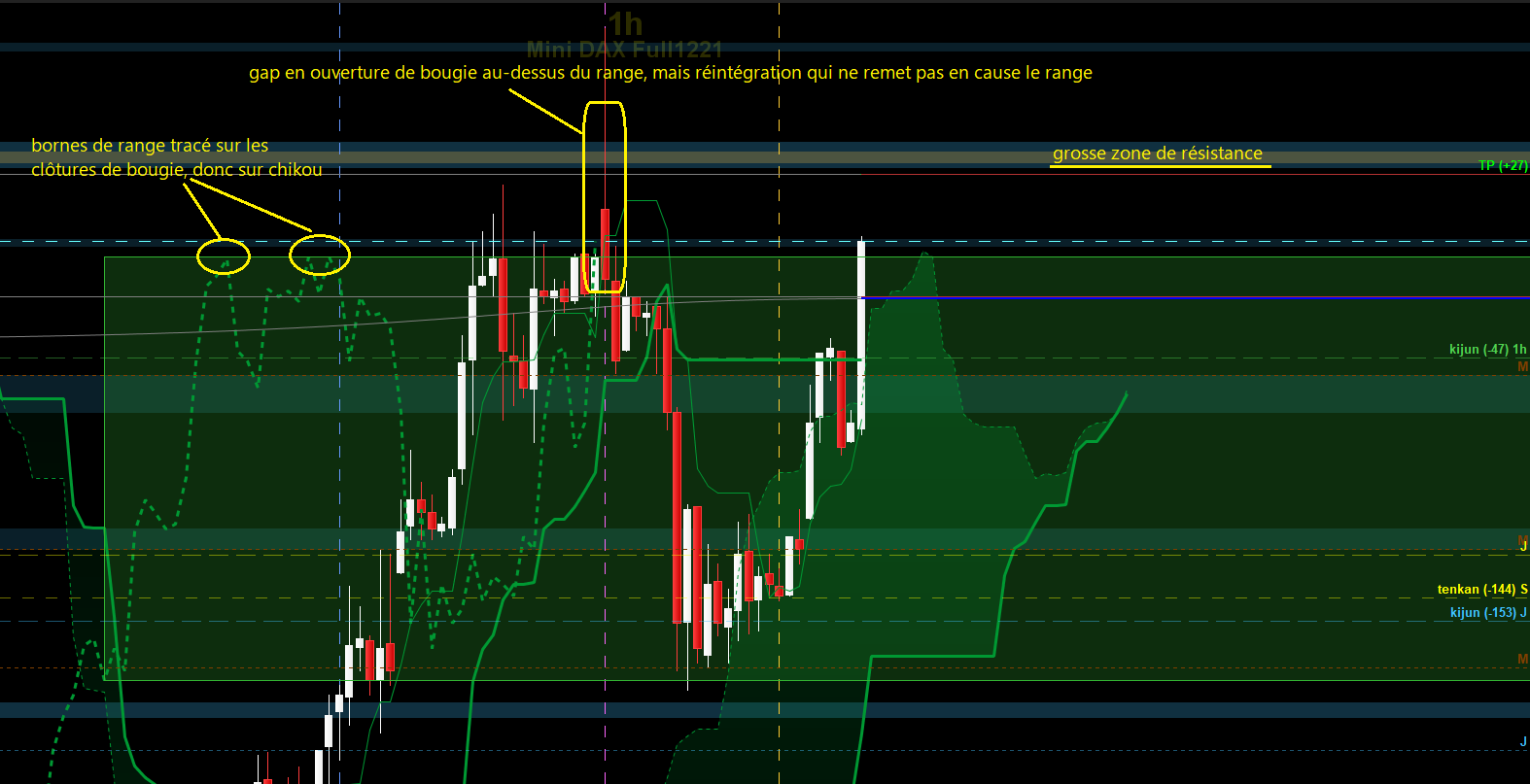 vous le savez, on trace les bornes des ranges sur les clôtures de bougie. Ainsi, lors d'un gap d'ouverture, il est normal que la bougie ouvre en-dehors du range sans pour autant le remettre en cause et c'est précisément ce qui s'est passé sur le dax le vendredi 24/09 sur la bougie indiquée. sur le graph vous voyez comment j'avais défini la borne haute de ce range H1, mais vous voyez aussi une grosse zone de résistance au-dessus (je ne l'explique pas ici, ce n'est pas le sujet de ce post). cette zone a repoussé la grande mèche de la bougie de gap. Il est toujours compliqué de s'adapter à ce type de grande mèche car l'espace entre le corps de la bougie et et le haut de la mèche est large. Si on lit les chandeliers, on voit un chandelier de retournement baissier (qui a parfaitement fonctionné, mais pour être invalidé, 2 idées s'opposent: soit les prix cassent son corps en clôture, soit ils cassent le haut de la mèche (cette seconde hypothèse est ma privilégiée pour invalider un chandelier de retournement, mais attention, c'est mon opinion, pas une vérité technique).