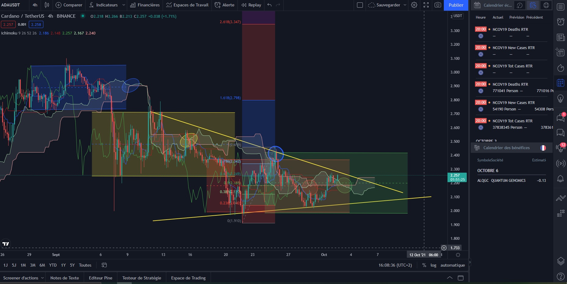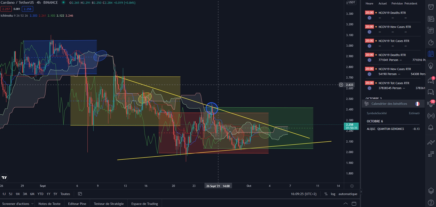 J'ai "remarqué aussi et tracé les droites de tendance en jaune, cela donnerai l'impression d'un triangle symétrique avec des plus bas de plus en plus haut, et des plus haut de plus en plus bas.