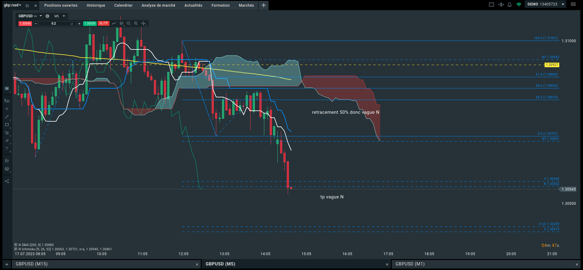 Ton graphique M15 montre simplement un range. Cassé par le bas. Une fois la cassure effectuée on retrace sur la kijun sen = au niveau de retracement de 50 % inutile de tracer des fibo pour savoir que le retracement kijun est = à 50%)
