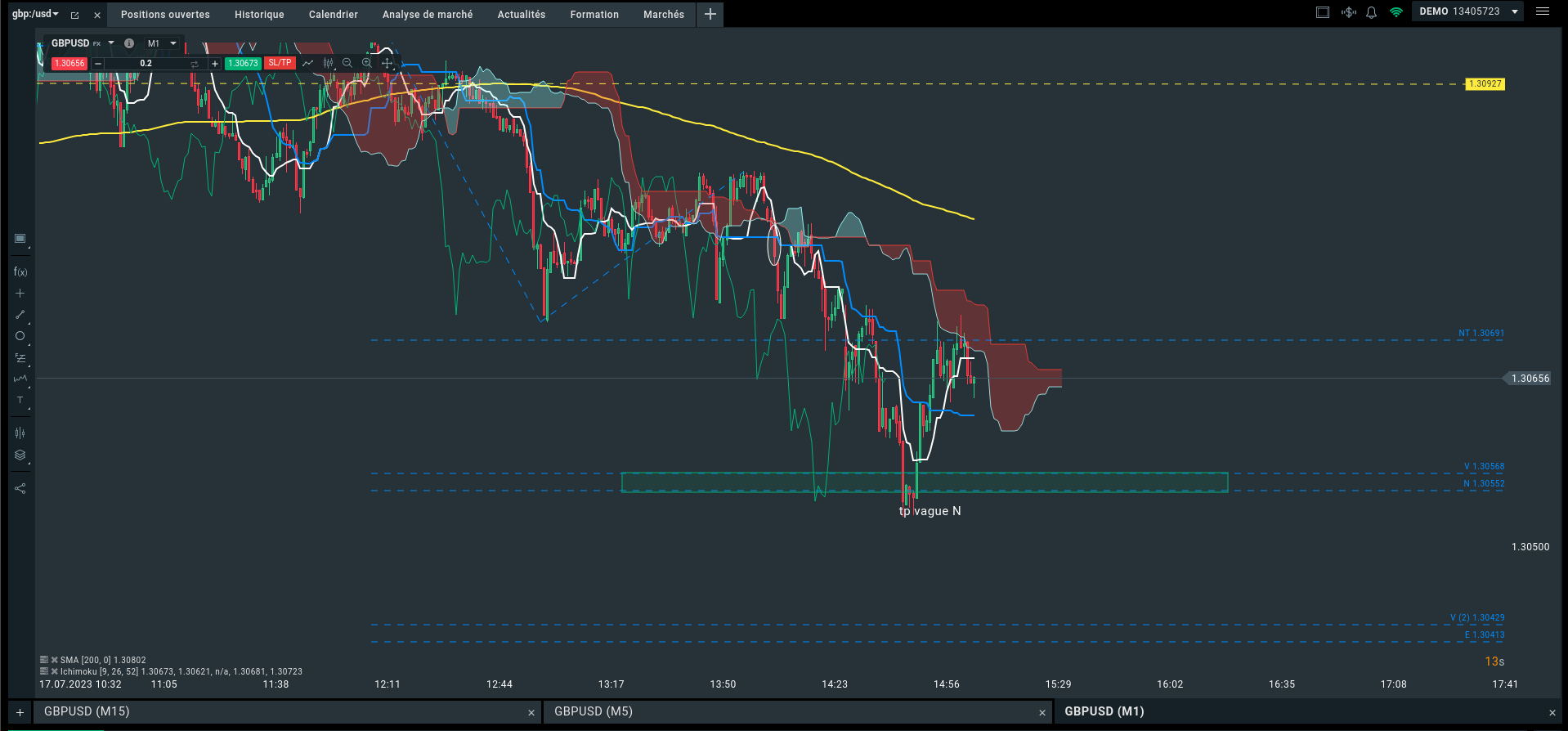On observe qu'une simple analyse classique , ultra rapide arrivait aux mêmes conclusions que toi mais alors du coup pourquoi utiliser ichimoku si c'est pour faire la même chose qu'une simple analyse chartiste ? Sans avoir tenu compte des lignes de l'ichimoku (kijun sen comme niveau de retracement pouvant déclencher un trade) ni les lignes et niveaux de l'ichimoku pour fixer ton TP sur ton M15 et en UT supérieures