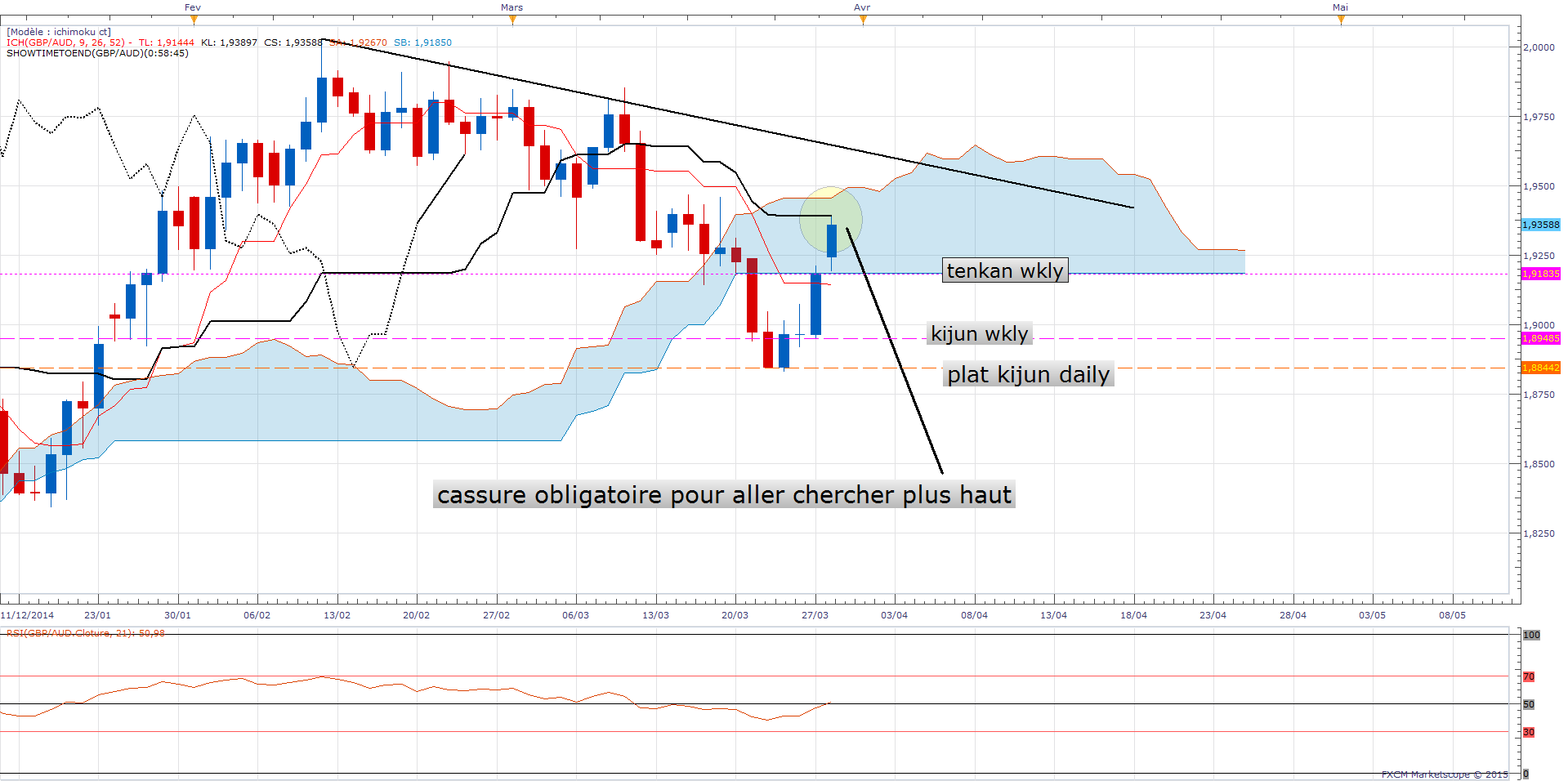GBPAUD H4 (cliquez sur les graphiques pour les agrandir) je voyais la possibilité ce matin (comme indiqué sur le dernier billet du blog) la possibilité d'entrer long sur le triple support (kijun, trend, borne haute de l'ancien range)